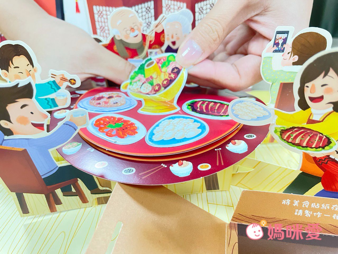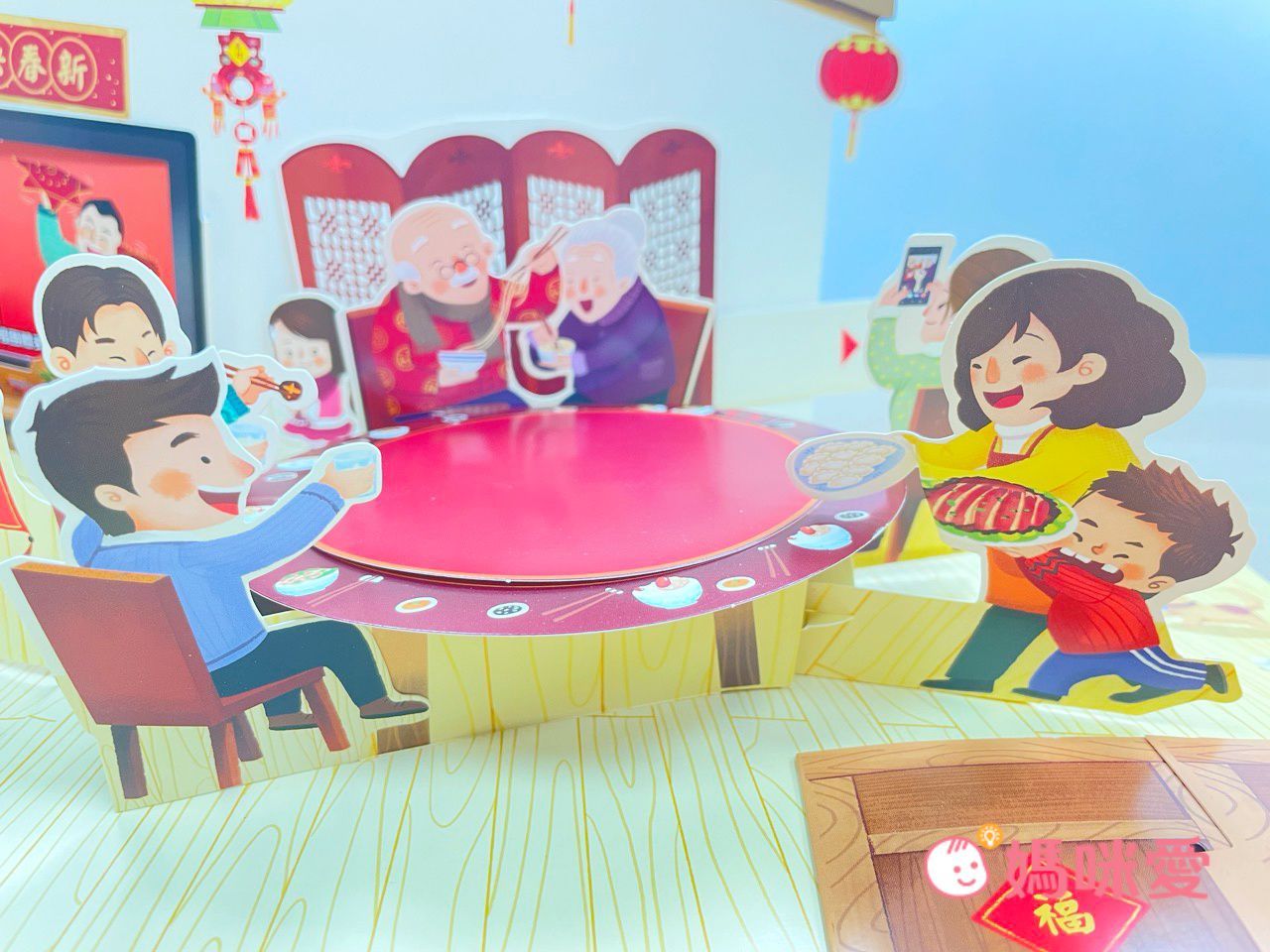 吃年夜飯的場景也是孩子的愛~現在新版團圓飯的場景變立體啦!媽媽妹妹在客廳看新年節目、親朋好友在餐桌聊天超熱鬧~