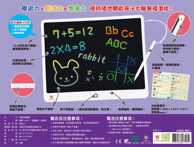 【12.5吋大畫板+收納筆槽,附畫筆掛繩+益智創意學習手冊,一鍵清除+智慧鎖定】