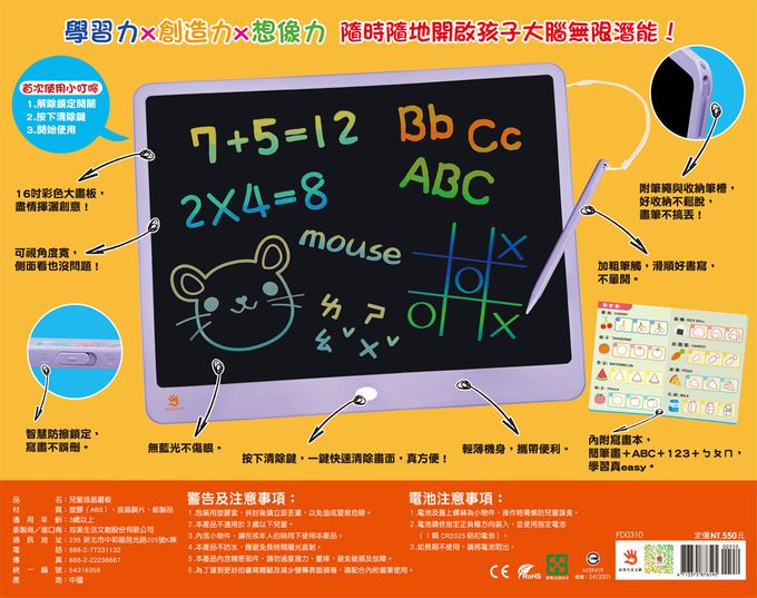 【16吋大畫板+收納筆槽,附畫筆掛繩+益智創意學習手冊,一鍵清除+智慧鎖定】