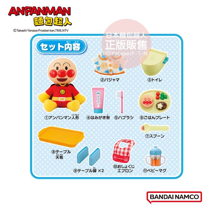 內含麵包超人玩偶、牙刷、牙膏、馬桶、睡衣、湯匙及餐盤等道具,