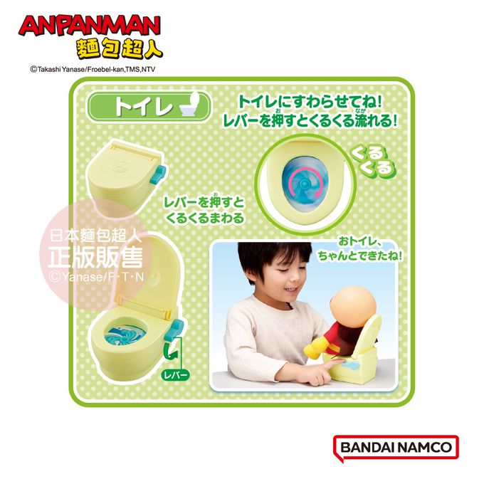 3. 馬桶:讓麵包超人坐在馬桶上,按下沖水閥,馬桶內的水流圖案也會滾動喔!