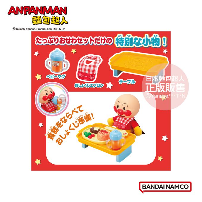 特別配件!幫麵包超人戴上圍兜,將餐盤放到小桌子上,還有果汁喔!