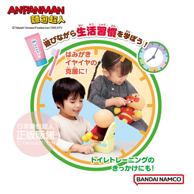 與麵包超人互動,從吃飯、刷牙、如廁、換衣服等玩法中,同時培養孩子學習刷牙及如廁訓練喔!