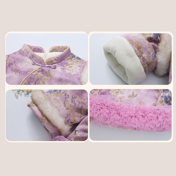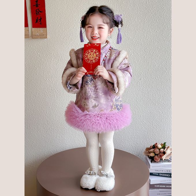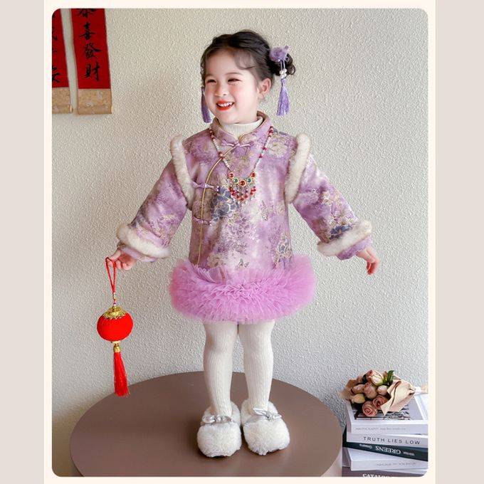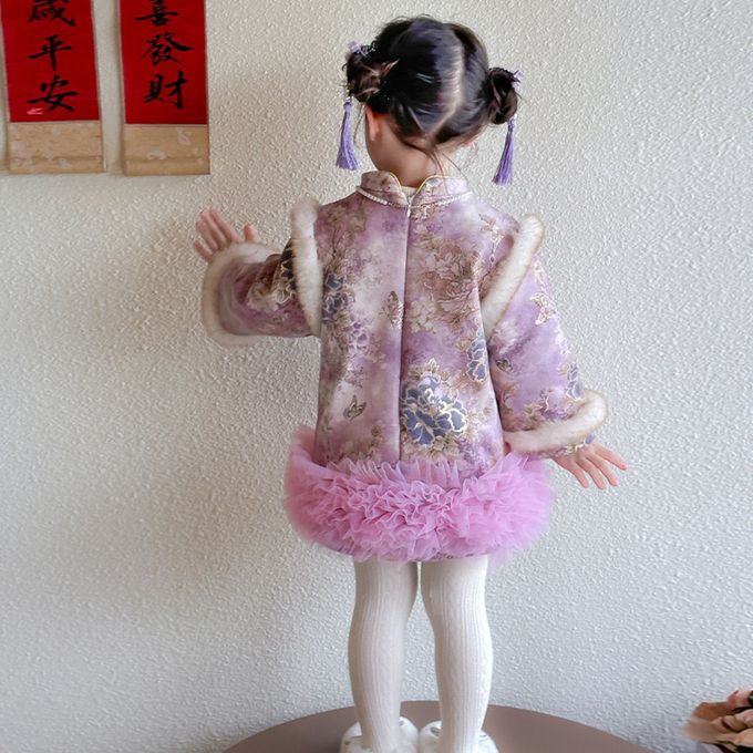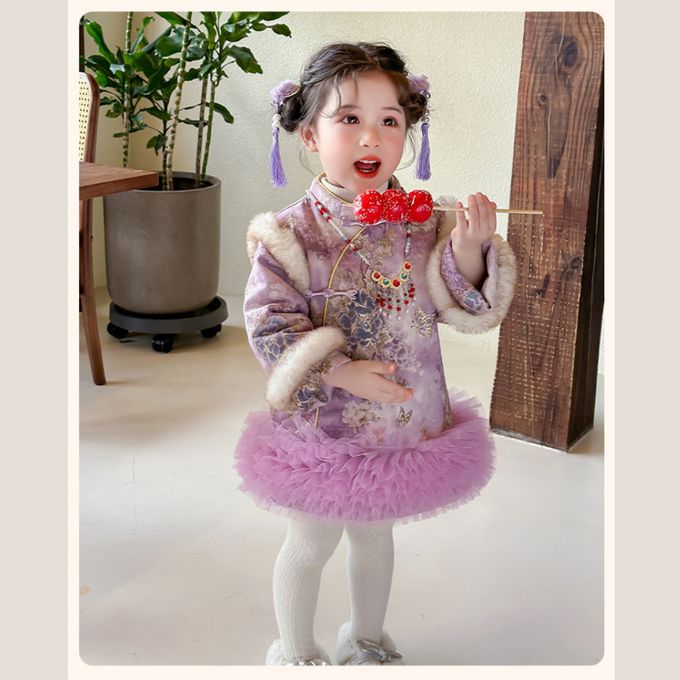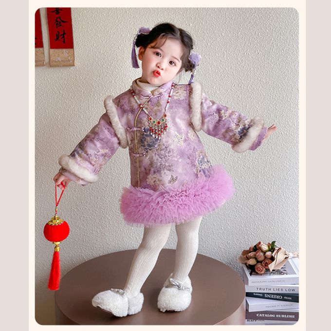 品名:新年拜年甜美旗袍領網紗風琴摺裙擺洋裝