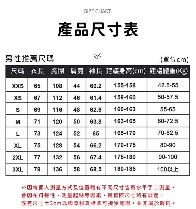 2XL:衣長77cm/胸圍132cm/肩寬56cm/袖長67.4cm/建議身高170-175cm/建議體重92.5-100cm