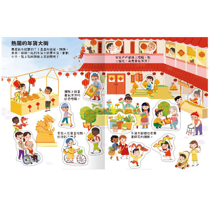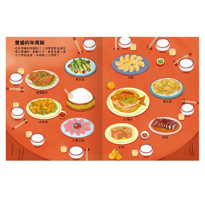 本書在書中後方附有超過150張一次性彩色紙,孩子們可以一邊閱讀書中的內容, 一邊照著書裡的指示動手貼貼看,將書中缺少的人物們、年菜和新年裝飾等貼紙,一一貼到書中,不僅能夠訓練手眼協調能力,也能透過互動學習的方式,提升孩子學習的樂趣!