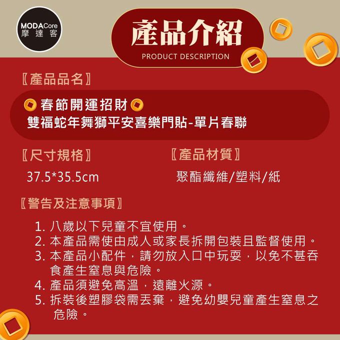 品名:◉春節開運招財◉雙福蛇年舞獅平安喜樂門貼-單片春聯