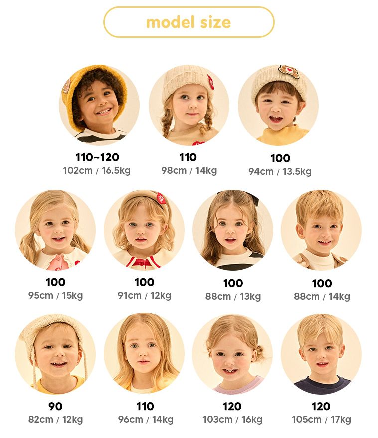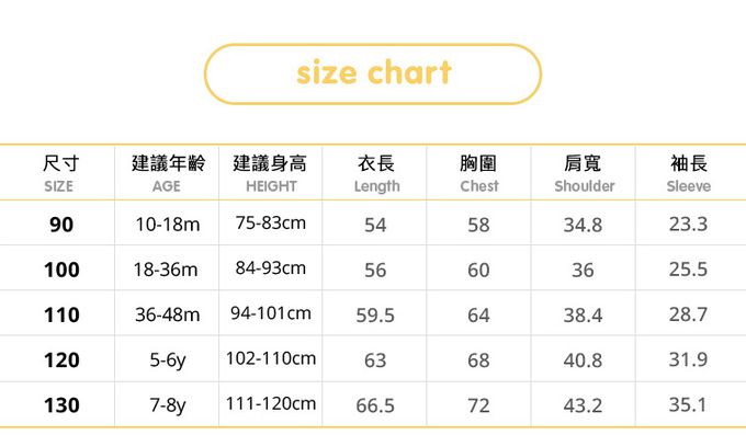 1. 尺寸表單位皆為公分(cm),實際尺寸會因布料彈性、水洗、測量起迄點等因素略有誤差。建議參考孩子平時穿著衣物尺寸進行選購。