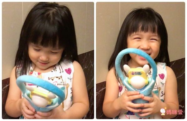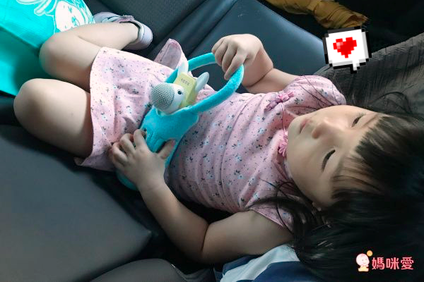 就連在車上,荳荳也捨不得放手。她說這是她的麥克風,她要抱著睡覺,就可以知道「卡拉牛牛」是多麼深得她的心啦XD