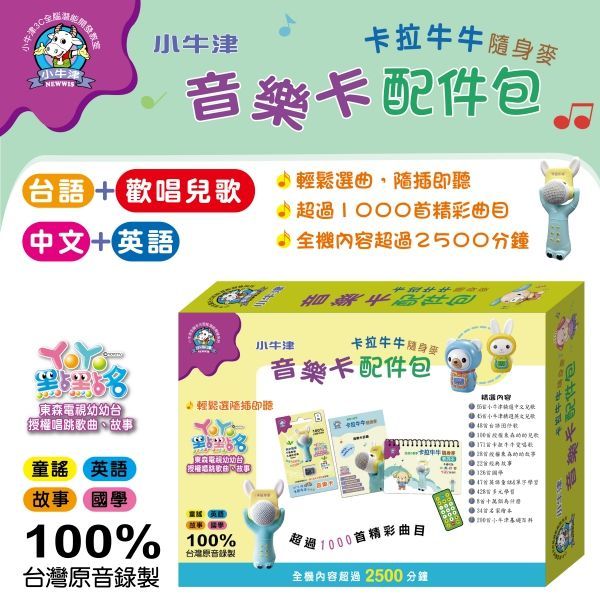 共含卡拉伴唱歌 172 首、2500 分讓寶貝鐘盡情唱,而且還可以連結手機藍牙播放其他音樂,不管兒歌、還是流行歌,牛牛都能駕馭唷!