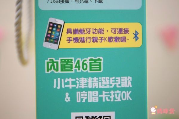 先不論配件包的 8G 記憶卡,內建 23 首中英台兒歌 + 23 首伴唱版中英台兒歌之外,還可以透過藍芽裝置連結手機,播放時下最流行的音樂,超級方便的~