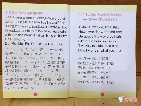 隨身麥本身其實就有內建 46 首歌曲了(當然必備有中文、英語童謠)這邊也給大家看一下曲目,歌詞本連歌曲與順序,在使用說明書中也都有詳細記載唷~還有歌詞本可以查看怎麼唱,以及英文歌曲的中文意思等等。