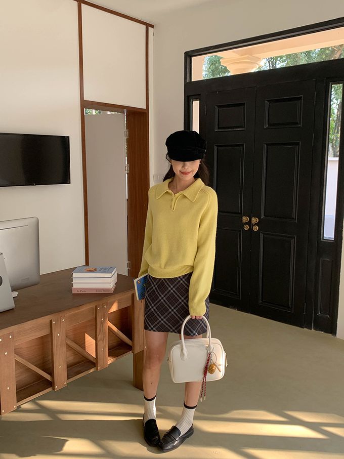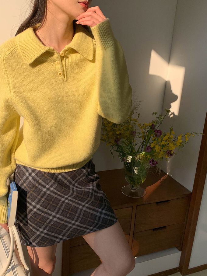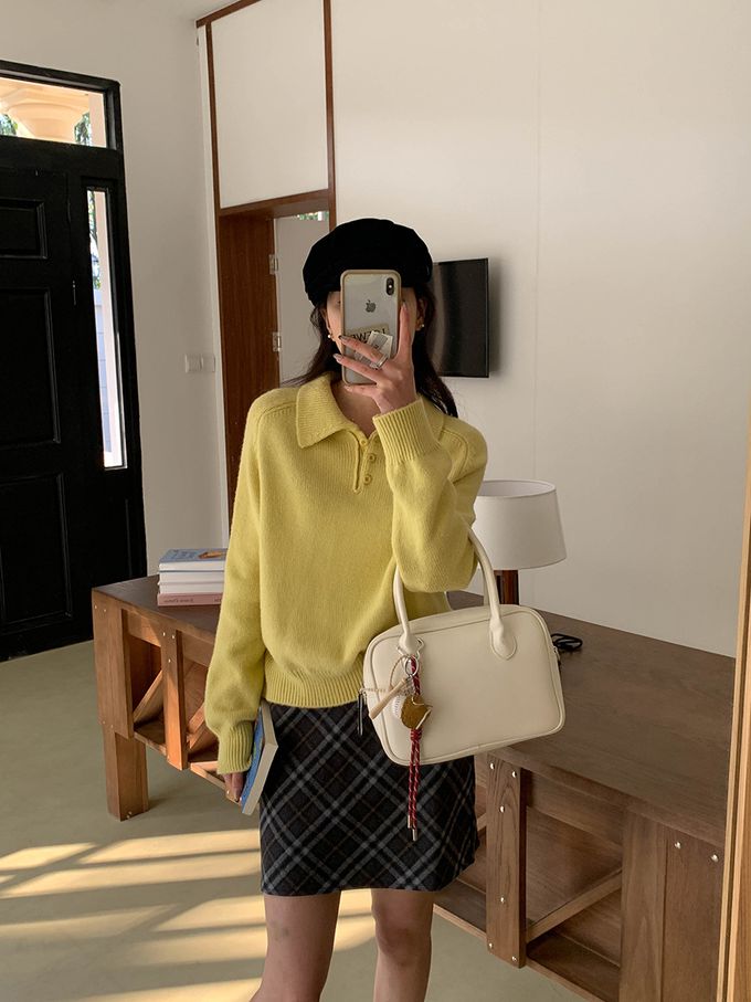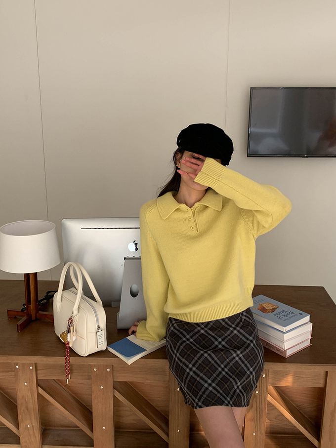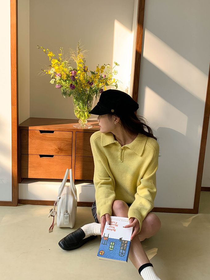 軟糯溫柔風polo翻領針織衫毛衣-黃色 (F)