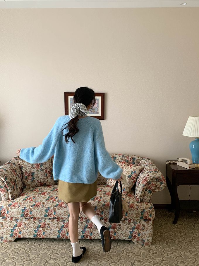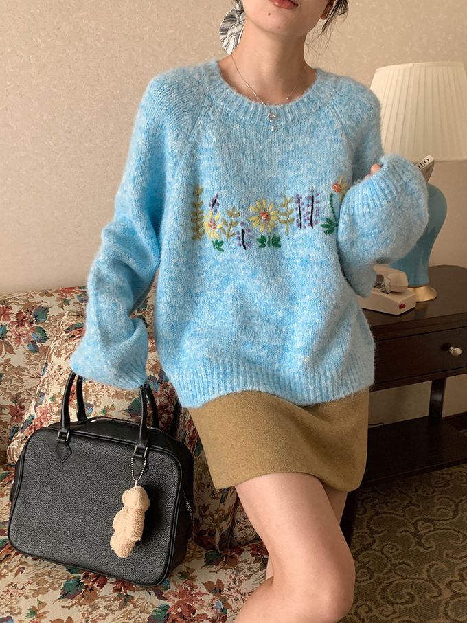 軟糯減齡刺繡花朵圓領寬鬆毛衣-淺藍 (F)