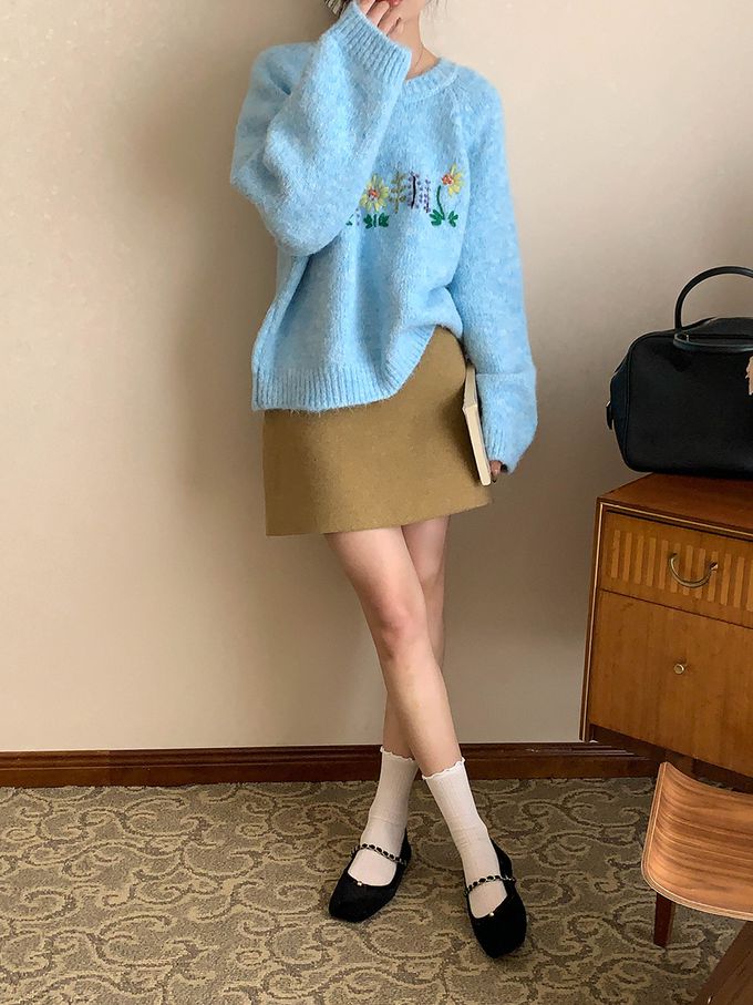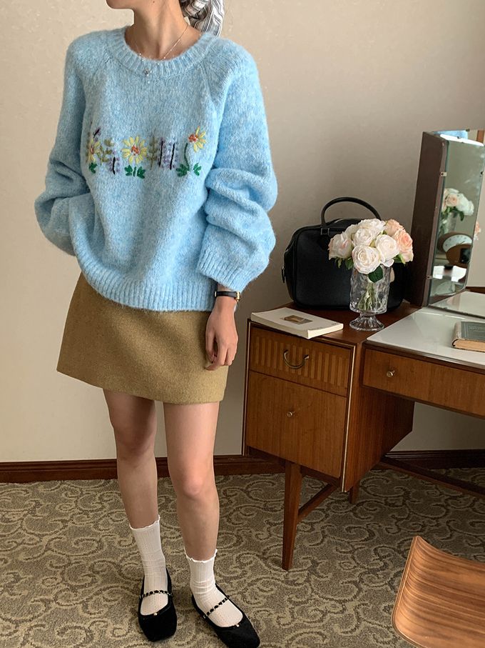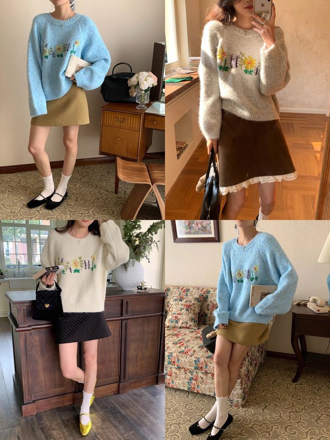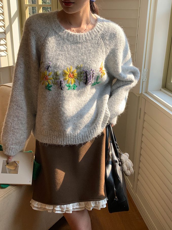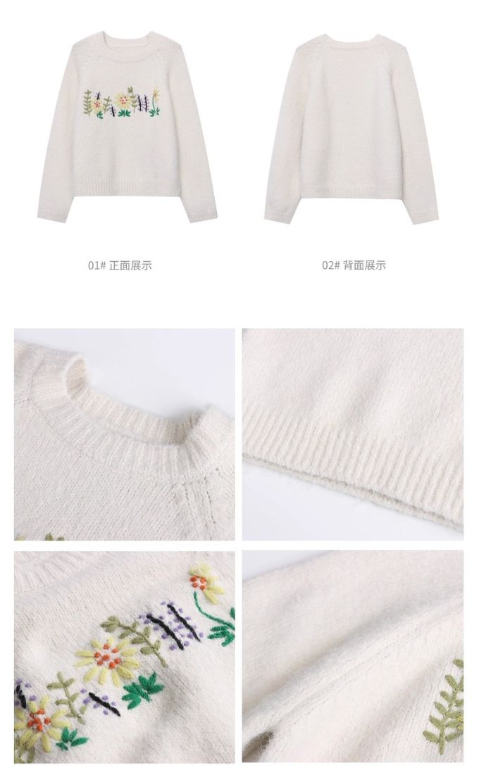 品名:軟糯減齡刺繡花朵圓領寬鬆毛衣