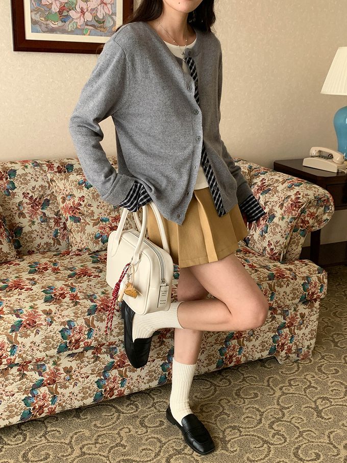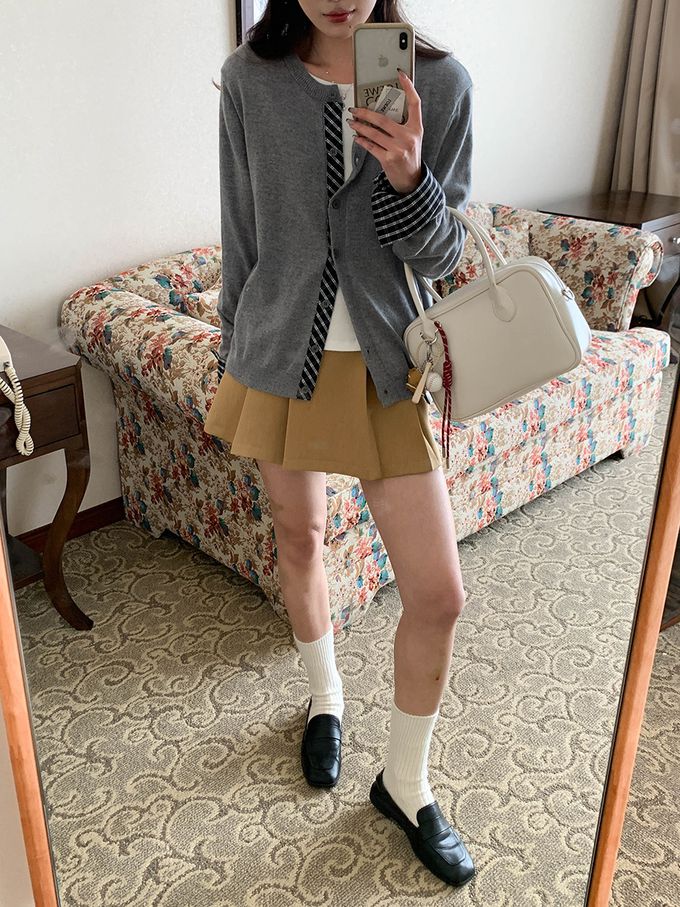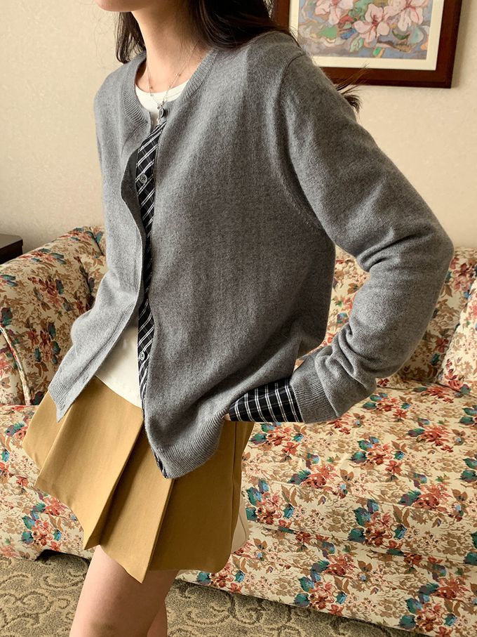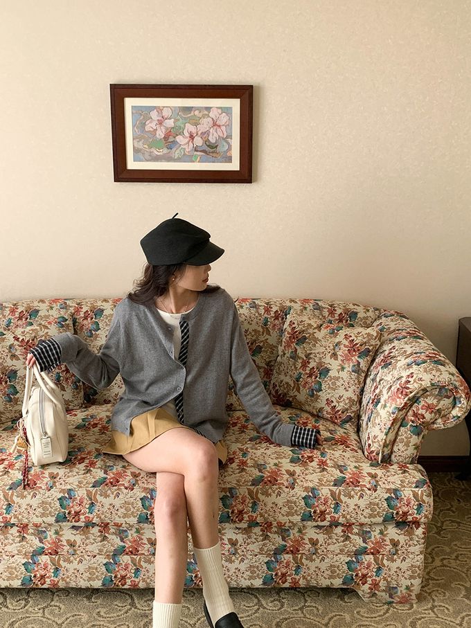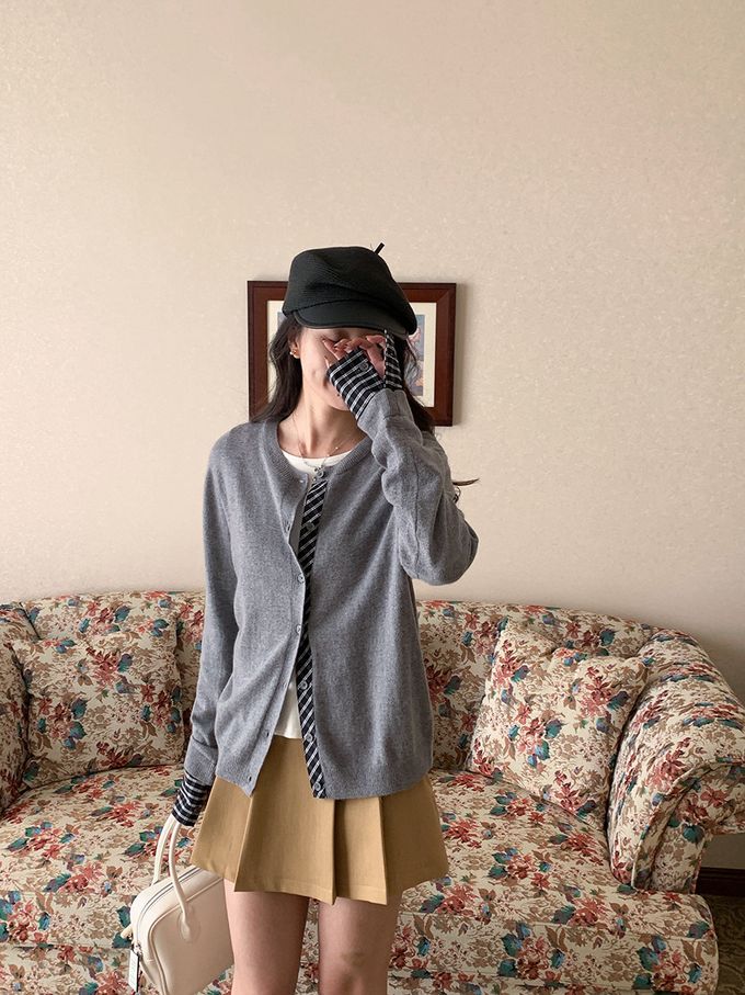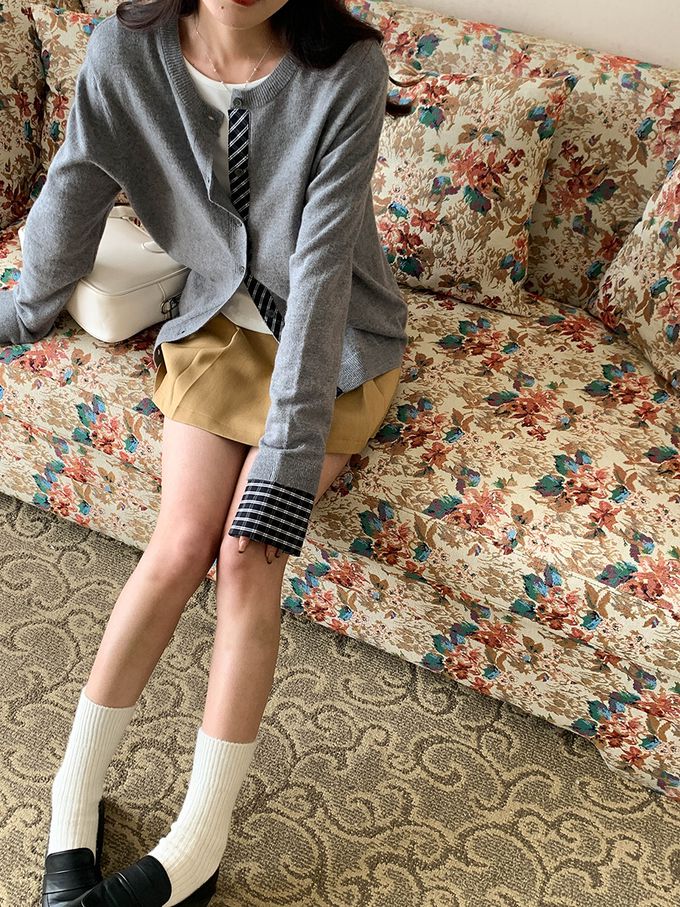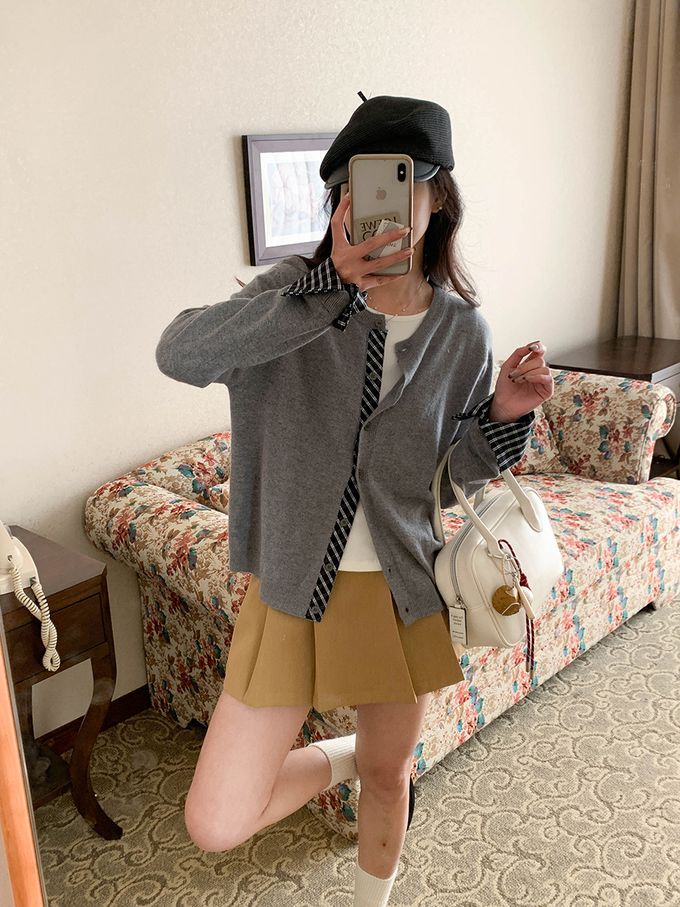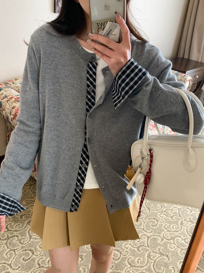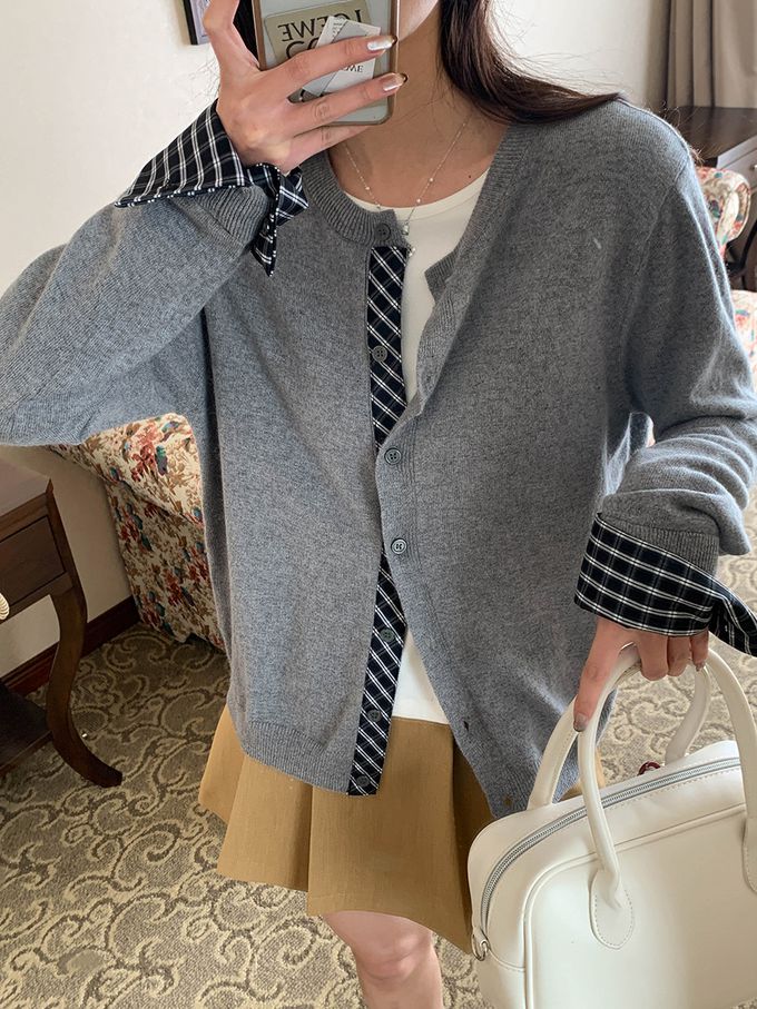 韓系歐膩撞色格紋拼接針織開襟衫-淺灰 (F)
