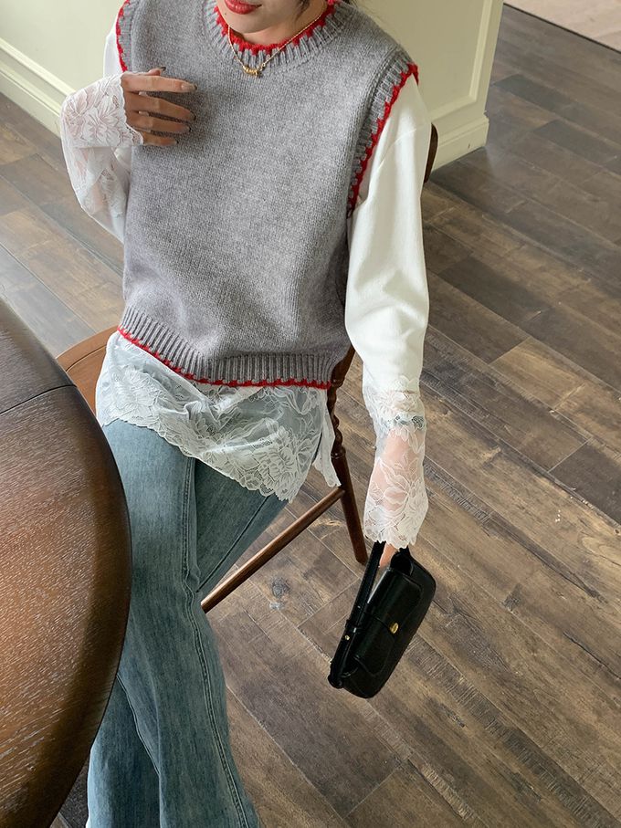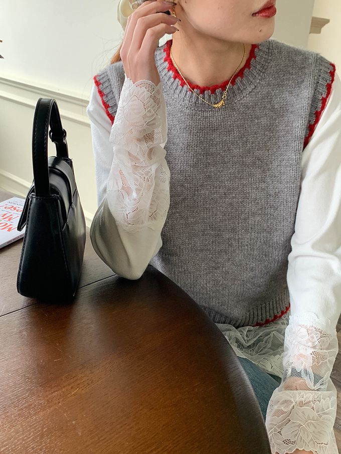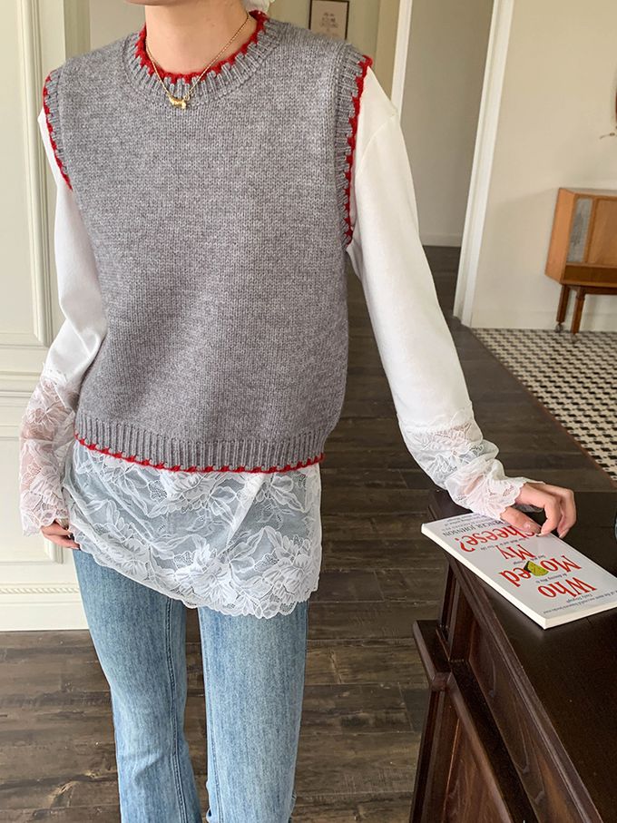 撞色縫邊圓領針織背心-灰色 (F)