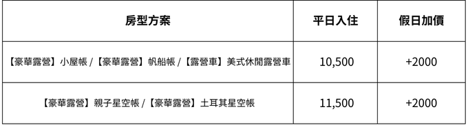 平日(週日 ~ 五)、假日(週六)每房+TWD$2,000