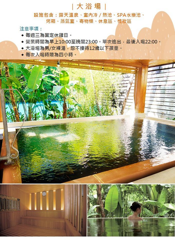 4.大浴場營業時間10:00~23:00(最後進場時間22:00);套餐供應時間12:00~22:00(最後點餐時間20:00)。