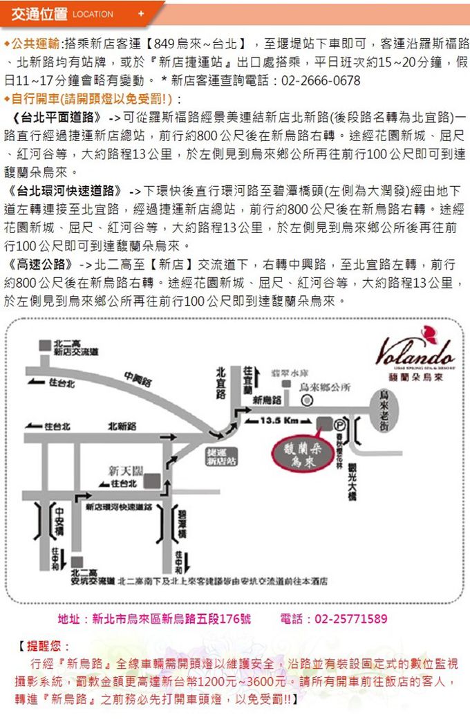 1.本券可2人於馥蘭朵烏來渡假酒店使用景觀湯屋60分鐘乙次及思鸝下午茶(現場價420+10%)2份。
