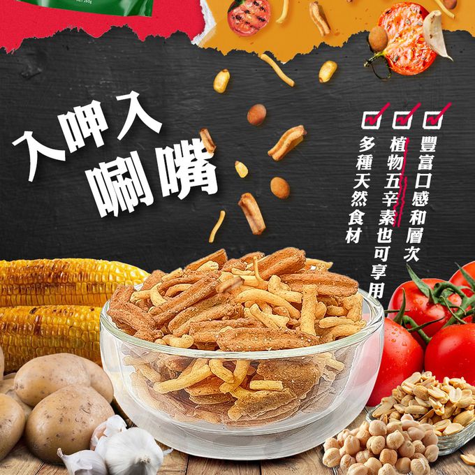 • 成分:燒烤花生塗層{麵粉[小麥、複方膨脹劑(碳酸氫鈉、酸性焦磷酸鈉)]、花生、糖、鹽、植物油(椰子油)、BBQ 味粉末(煙燻香料、鹽、麥芽糊精、糖、關華豆膠、磷酸鈣)、紅椒、蔬菜混合粉(大蒜、洋蔥、辣椒、番茄)、碳酸氫鈉}、調味麵條[(混合麵粉(米、鷹嘴豆、玉米)、樹薯澱粉、植物油(葵花油、芥花籽油、橄欖油)、糖、竹筍纖維、鹽、蔬菜混合粉(大蒜、洋蔥、辣椒、番茄)、香辛料(紅椒、辣椒、芥末)、酵母萃取物、天然香料(含牛奶、大豆)、檸檬酸、乳清粉(來自牛奶)、香草(迷迭香葉)]、大豆脆片{小麥澱粉、植物油(葵花油、芥花籽油、橄欖油)、大豆豆粕、糖、蔬菜混合粉(大蒜、洋蔥、辣椒、番茄)、鹽、大麥麥芽萃取物、醬油粉[醬油(小麥、大豆、鹽)、麥芽糊精、鹽]、細香蔥、竹筍纖維}、烤玉米[玉米、植物油(葵花油)、燒烤粉末(麥芽糊精、鹽、天然香料、煙燻香料、檸檬酸)]。