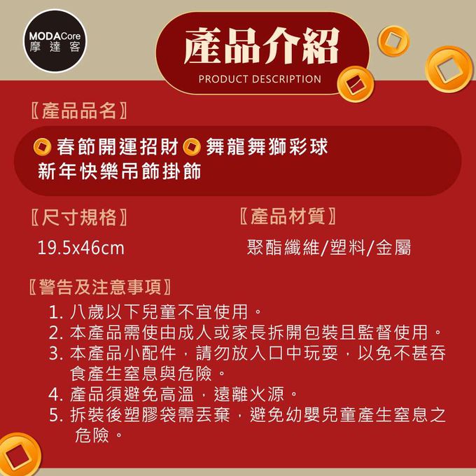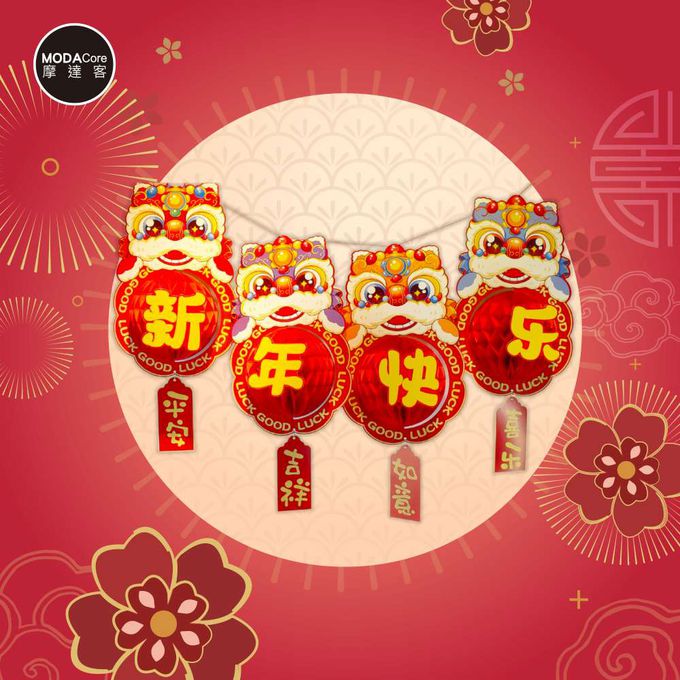 品名:◉春節開運招財◉舞龍舞獅立體蜂巢球新年快樂吊飾掛飾(1組4片入)