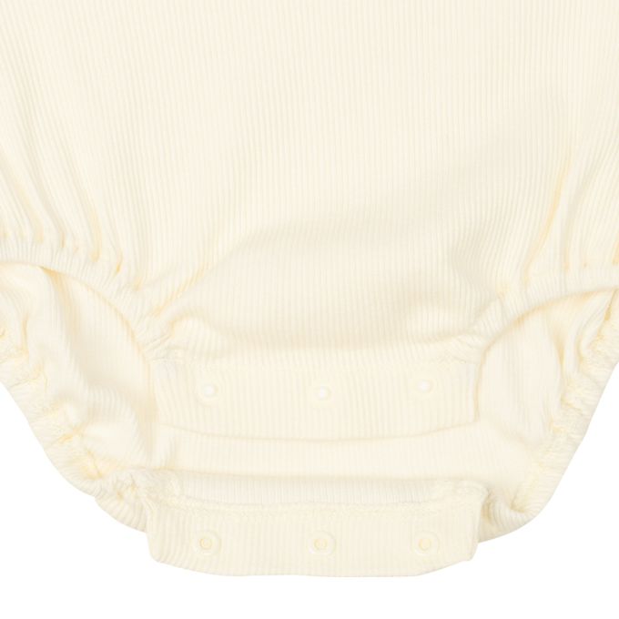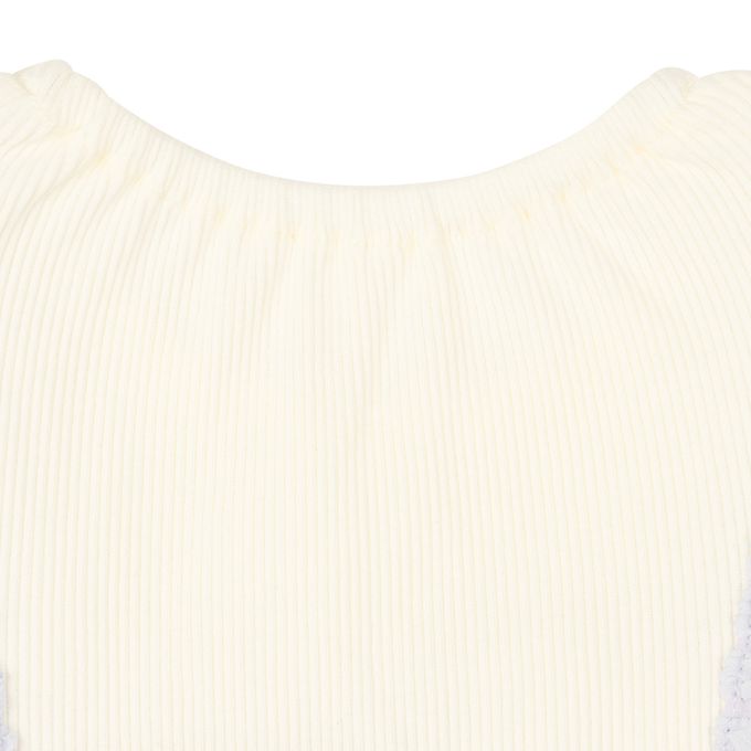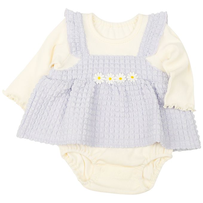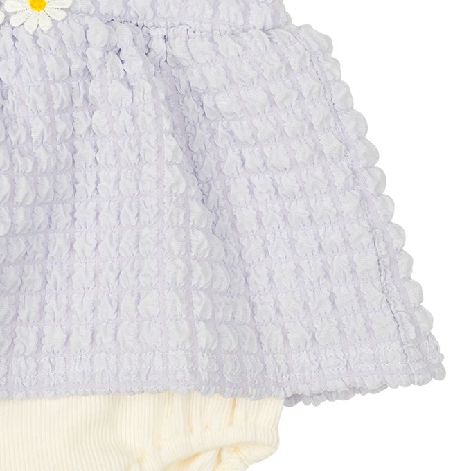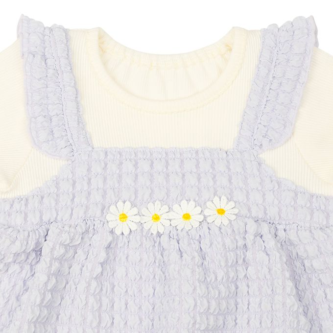 肩帶部分的荷葉邊和腰部拼接處的花卉蕾絲裝飾,突顯出女孩的可愛氣質。