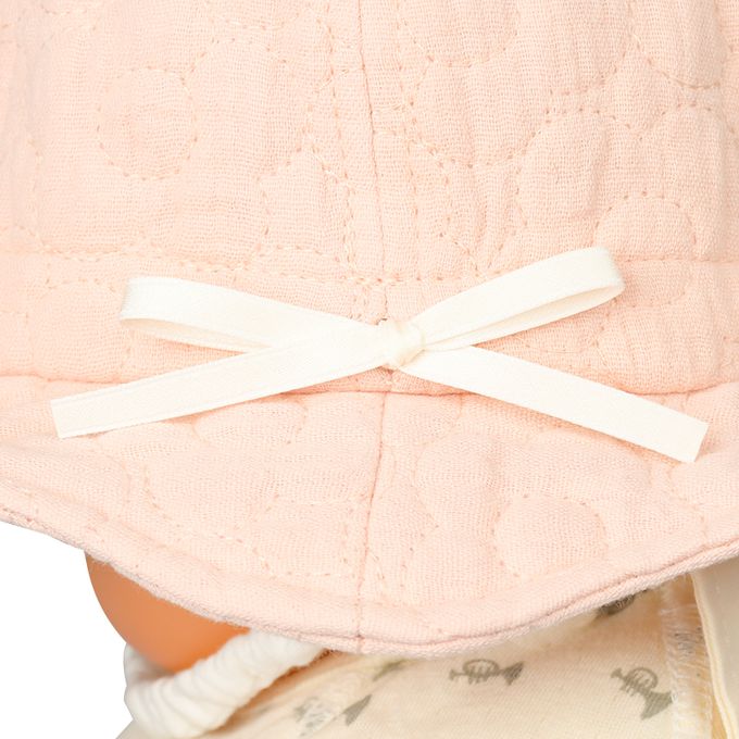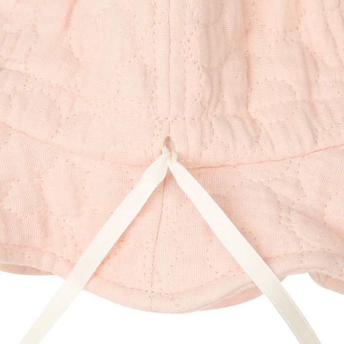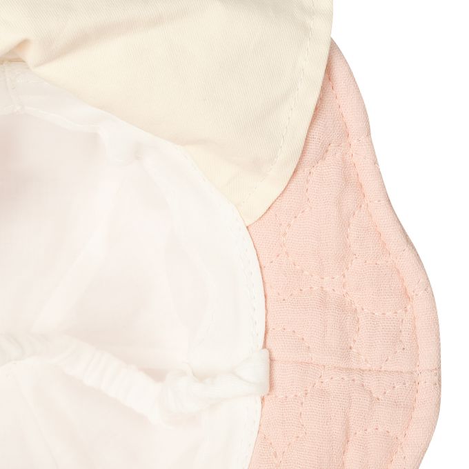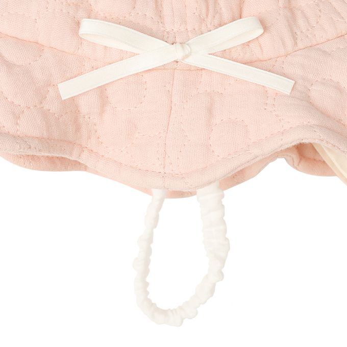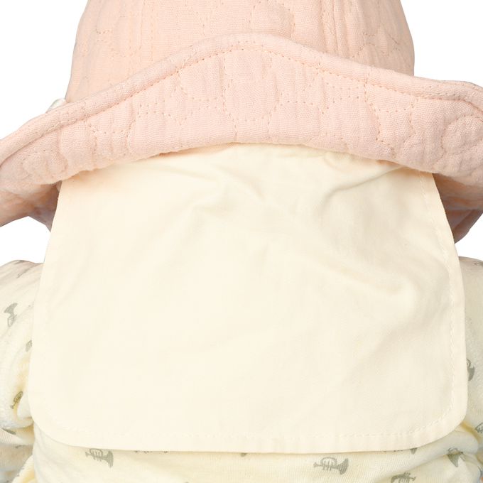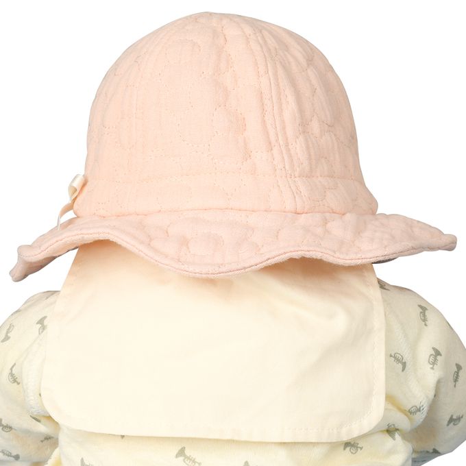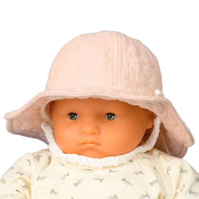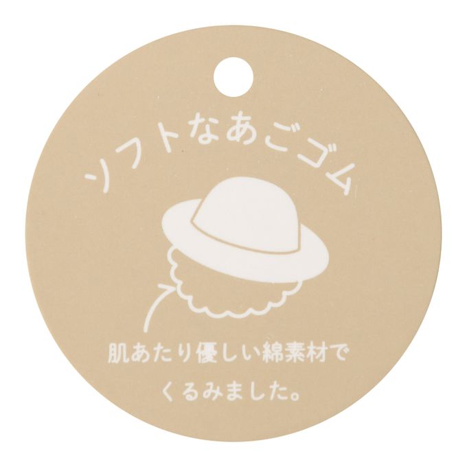下巴有鬆緊帶可防止被風等吹落。下巴鬆緊帶用布料裹住,使膚觸更舒適。