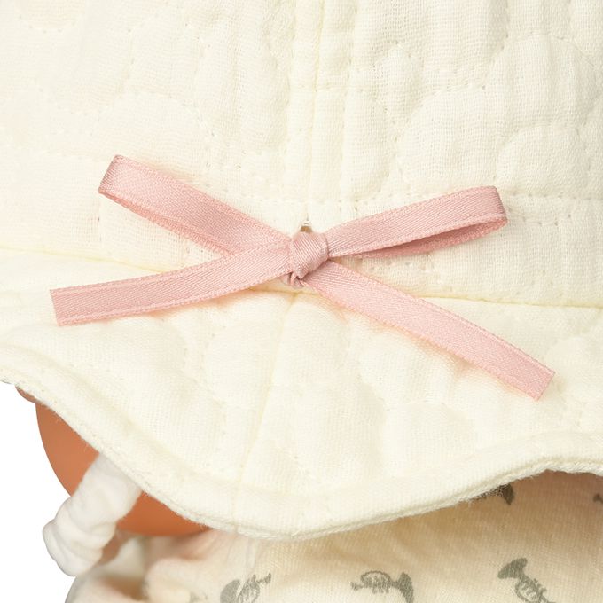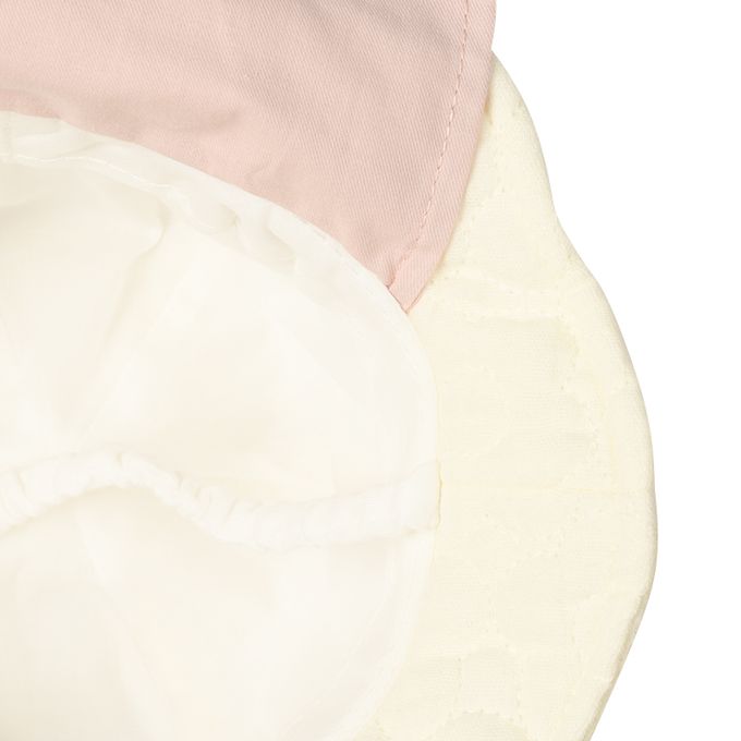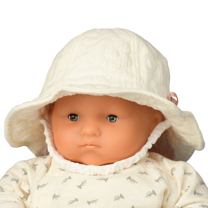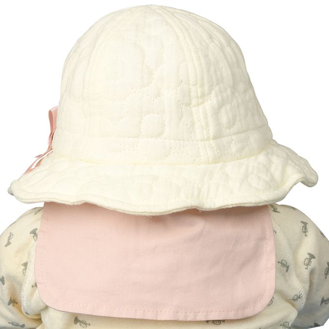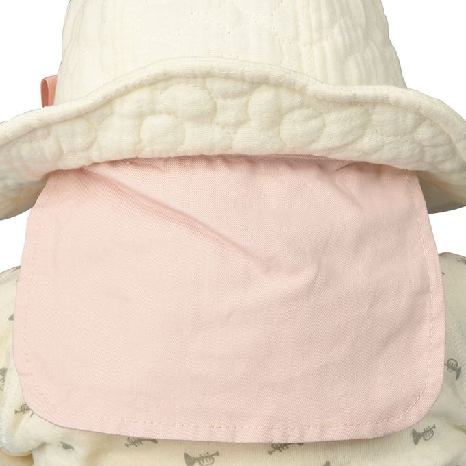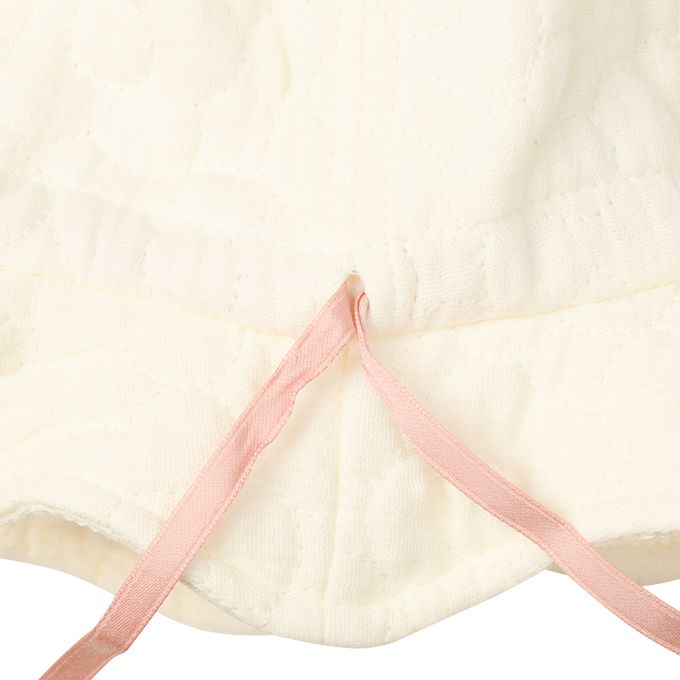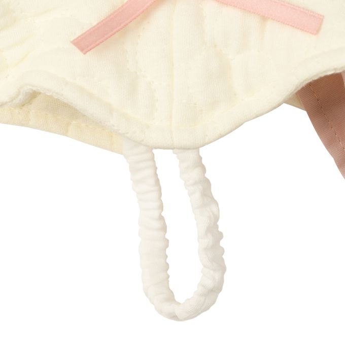 下巴有鬆緊帶可防止被風等吹落。下巴鬆緊帶用布料裹住,使膚觸更舒適。