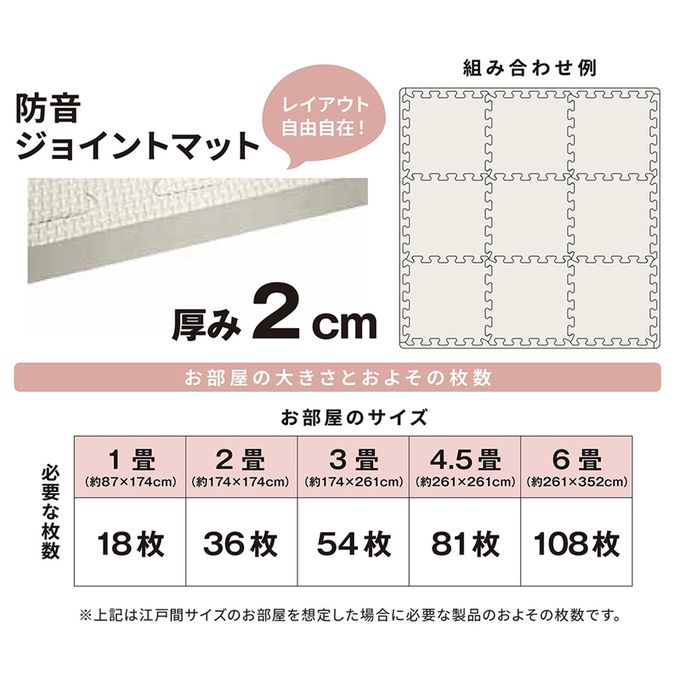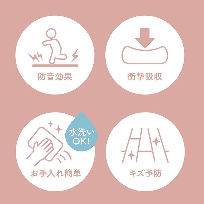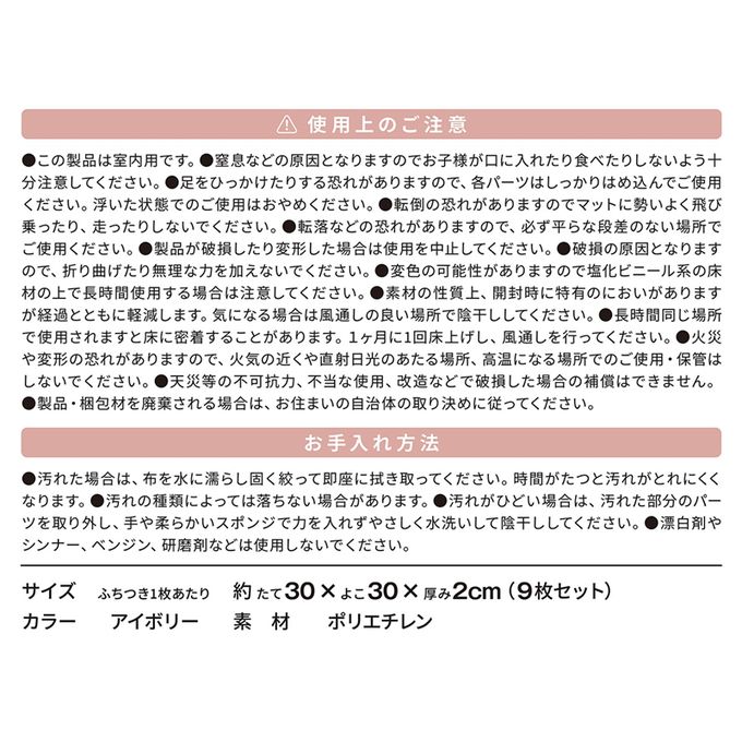 注意事項:●本產品為室內用。●由於可能會引起窒息,請注意不要讓幼童將此物放入口中或吞食。●每個零件都要確實拼接完整且平整,以免被絆倒。若拼接得不平整,有部分浮起時,請勿使用。●請勿快速跳上墊子或在墊子上奔跑,以免跌倒。●請勿使用已受損或變形的產品。●請勿用力扭轉或拉扯,因有可能造成破損。●由於可能會變色,請注意避免在氯乙烯類地板材上長時間使用。●由於材質本身的特性,開封時會有特殊的氣味,但隨著時間的推移會減少。若氣味讓您感到不適,請在通風良好的地方陰乾。●長時間在同一地點使用,可能會與地板黏合,請每月將其抬起一次並通風。●請勿在火源附近、陽光直射處或高溫場所使用或存放,以免發生火災或變形。●對於因天災等不可抗力、不當使用、改裝等情況導致的損壞,無法提供賠償。●丟棄時請遵循各地方環保局的規定處理。