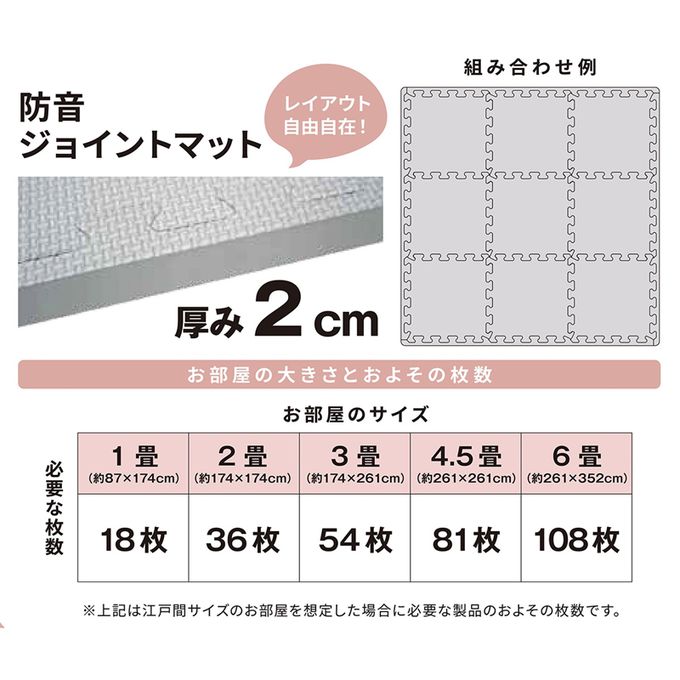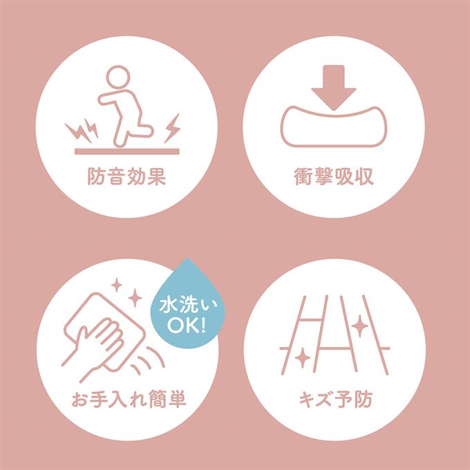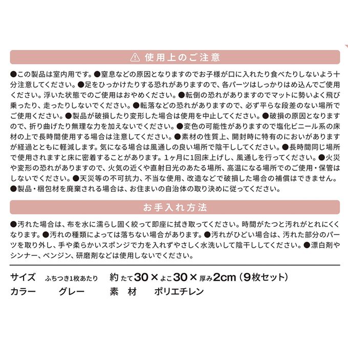 注意事項:●本產品為室內用。●由於可能會引起窒息,請注意不要讓幼童將此物放入口中或吞食。●每個零件都要確實拼接完整且平整,以免被絆倒。若拼接得不平整,有部分浮起時,請勿使用。●請勿快速跳上墊子或在墊子上奔跑,以免跌倒。●請勿使用已受損或變形的產品。●請勿用力扭轉或拉扯,因有可能造成破損。●由於可能會變色,請注意避免在氯乙烯類地板材上長時間使用。●由於材質本身的特性,開封時會有特殊的氣味,但隨著時間的推移會減少。若氣味讓您感到不適,請在通風良好的地方陰乾。●長時間在同一地點使用,可能會與地板黏合,請每月將其抬起一次並通風。●請勿在火源附近、陽光直射處或高溫場所使用或存放,以免發生火災或變形。●對於因天災等不可抗力、不當使用、改裝等情況導致的損壞,無法提供賠償。●丟棄時請遵循各地方環保局的規定處理。