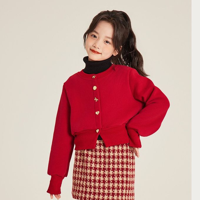 品名:新年拜年紅色法式蝴蝶結金釦棉質開襟衫外套(內裡銀狐絨)