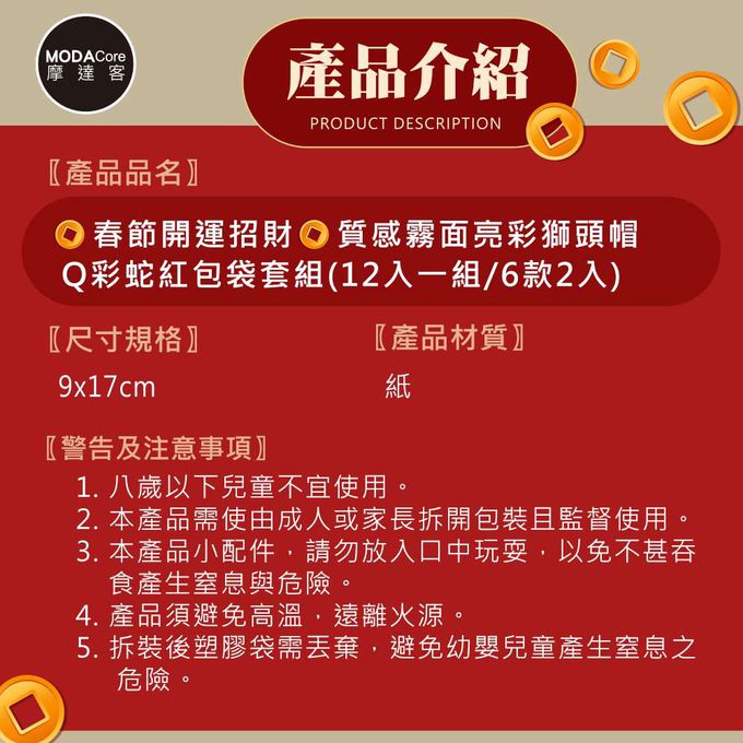 品名:◉春節開運招財◉質感霧面亮彩獅頭帽Q彩蛇紅包袋套組(12入一組/6款2入)