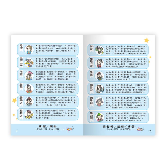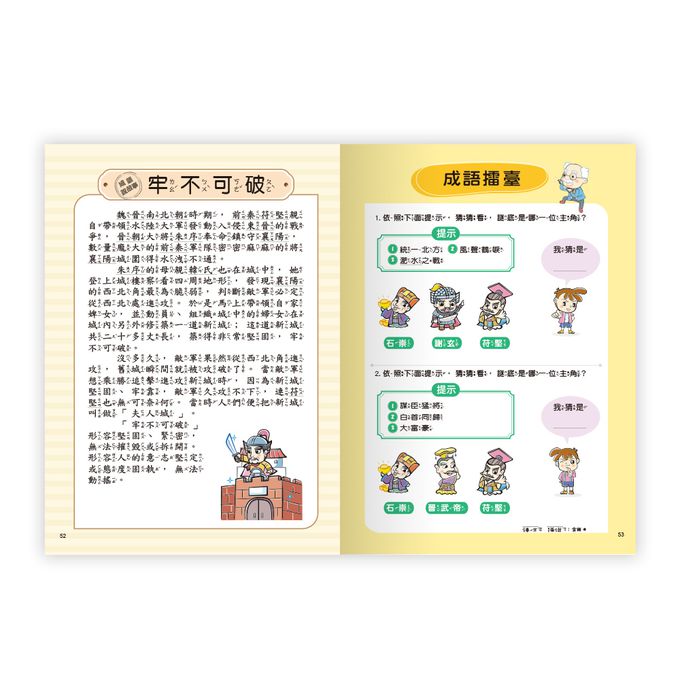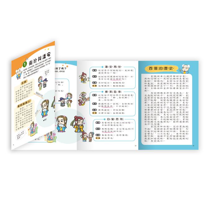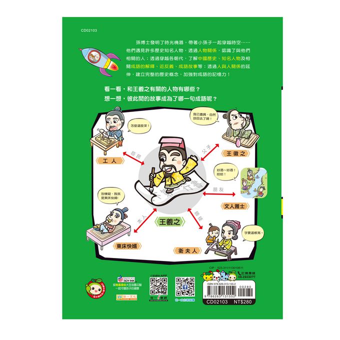 跟著書中的人物穿越時空,遇見古代知名人物,像是苻堅.謝玄.唐高祖.唐太宗.李白.蘇東坡等,透過人物關係.歷史背景,認識每個成語背後的意義,除了讓孩子更能夠更了解成語的典故.解釋,還能再加以延伸.運用,輕輕鬆鬆學歷史,建立歷史 朝代的概念,還能透過趣味的人物關係與成語故事,把成語通通都記起來!