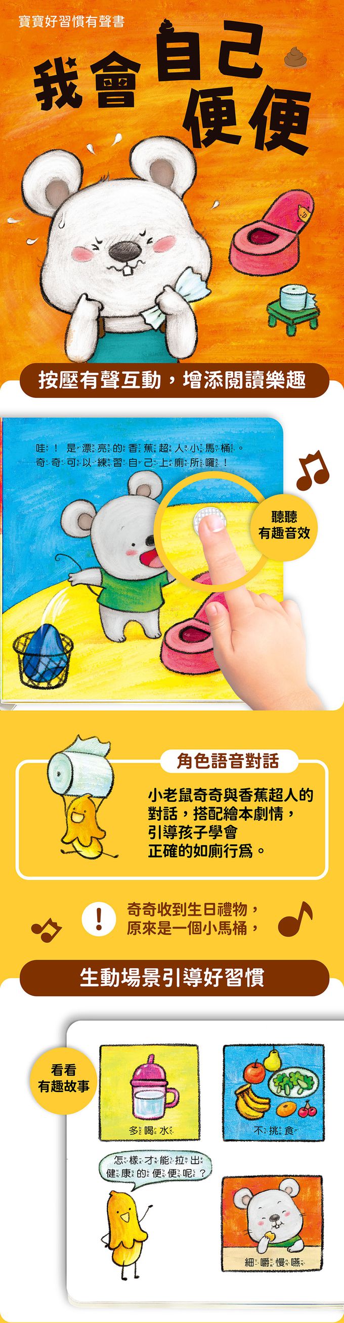 角色語音對話: 小老鼠奇奇與香蕉超人的對話,搭配繪本劇情,引導孩子學會正確的如廁行為。