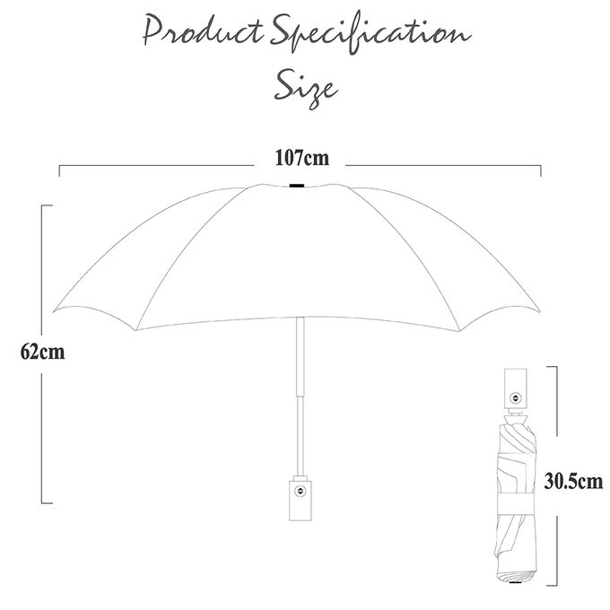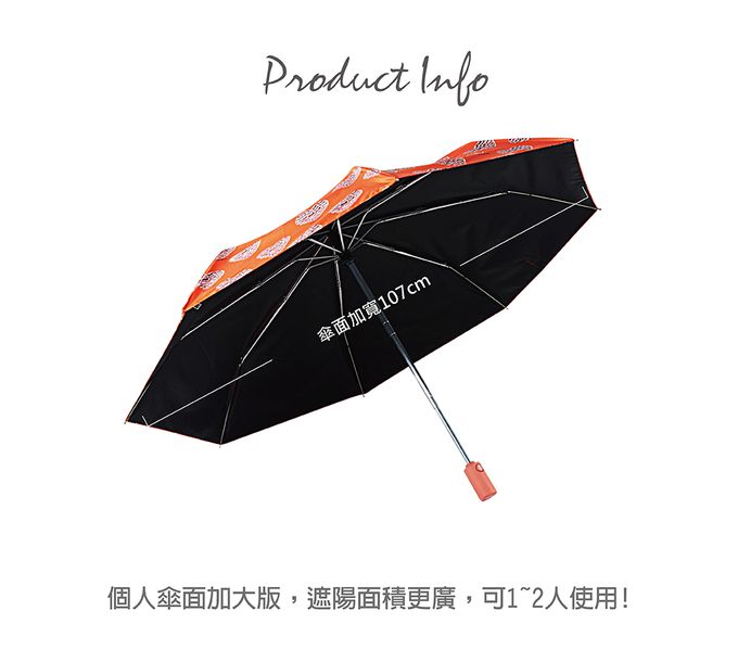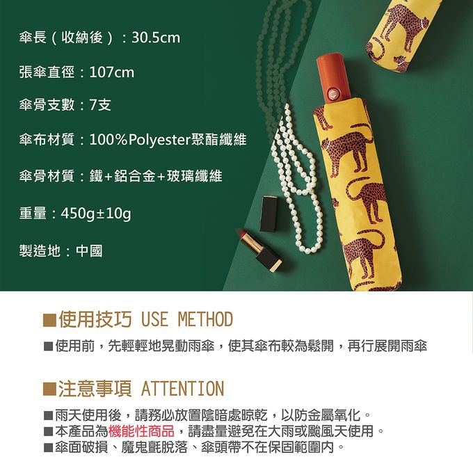 注意事項:1.雨天使用後,請務必放置於陰暗處晾乾,以防金屬氧化。 2.本產品為機能性商品,請盡量避免在大雨或颱風天使用。