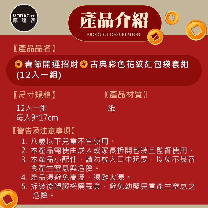 品名:◉春節開運招財◉古典彩色花紋紅包袋套組(12入一組)