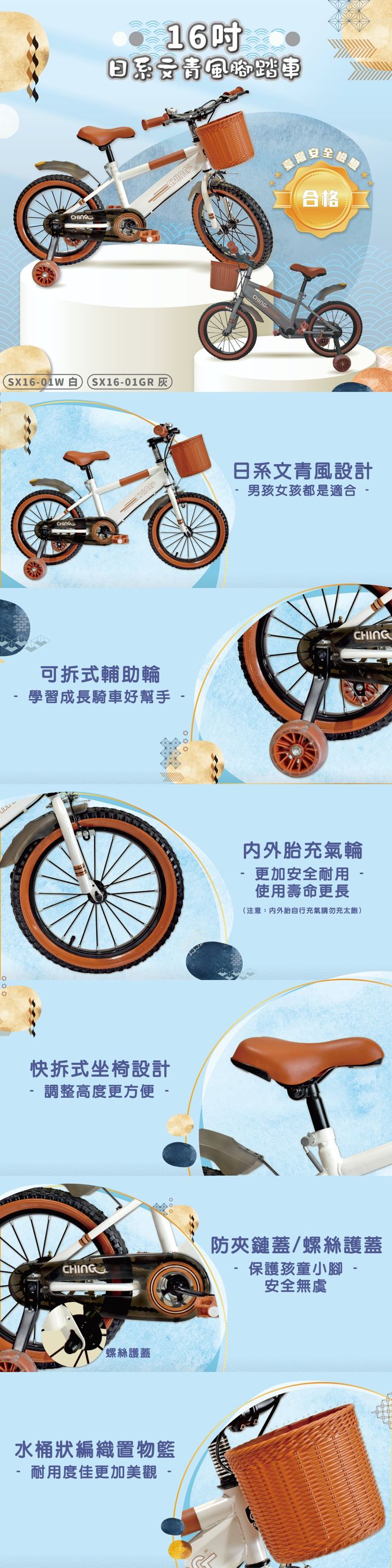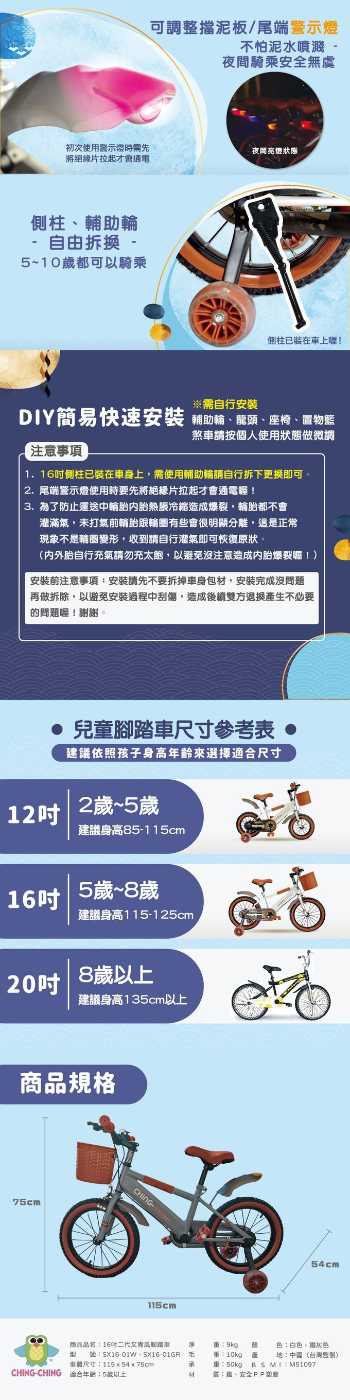 ** 此為DIY簡易快速安裝腳踏車,只需自行安裝輔助輪、龍頭、座椅、置物籃,前後煞車出廠已做調整,可再按照個人所需做微調即可。