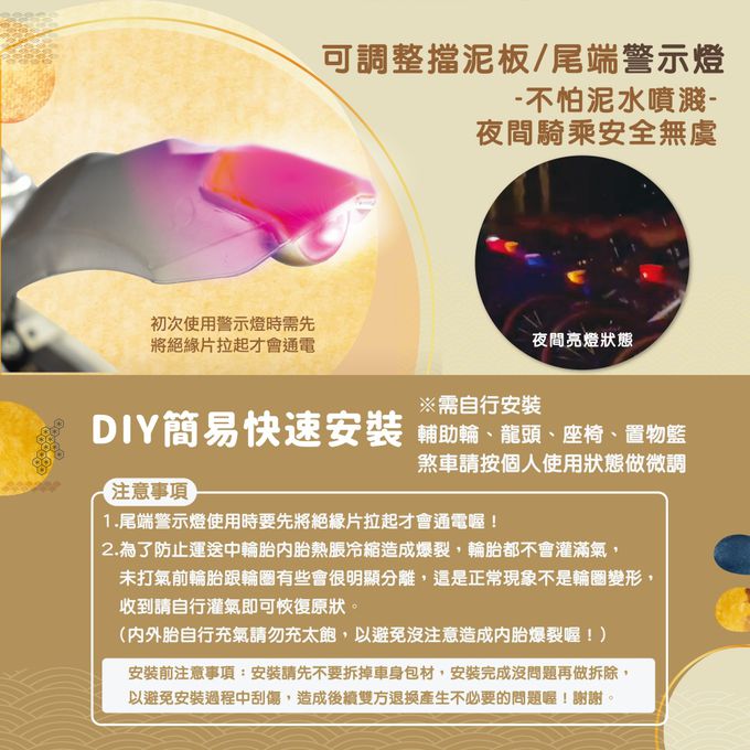 1.尾端警示燈使用時要先將絕緣片拉起才會通電喔! 2.為了防止運送中輪胎內胎熱脹冷縮造成爆裂,輪胎都不會灌滿氣,未打氣前輪胎跟輪圈有些會很明顯分離,這是正常現象不是輪圈變形,收到請自行灌氣即可恢復原狀。