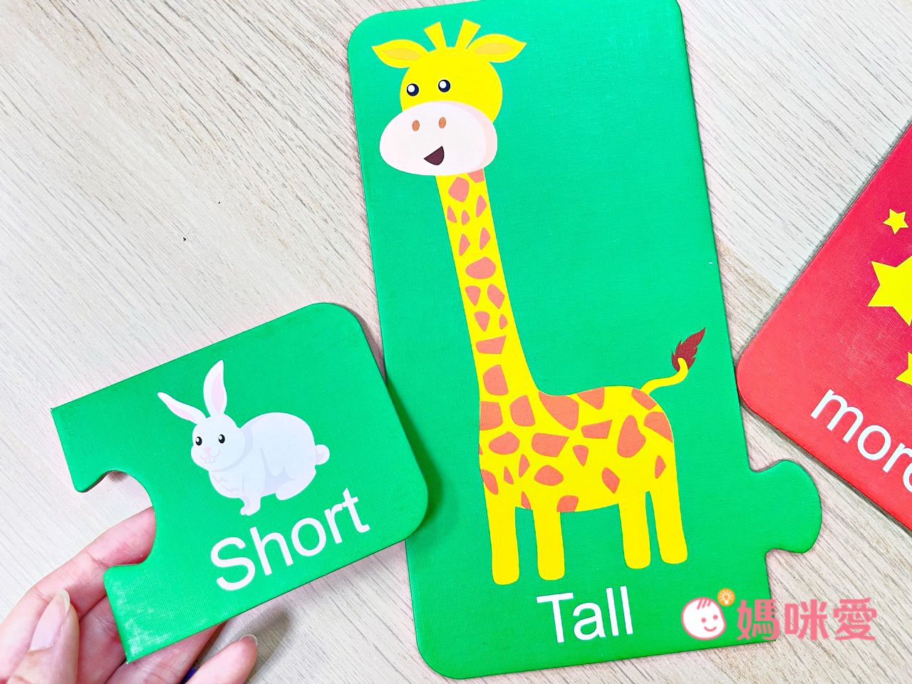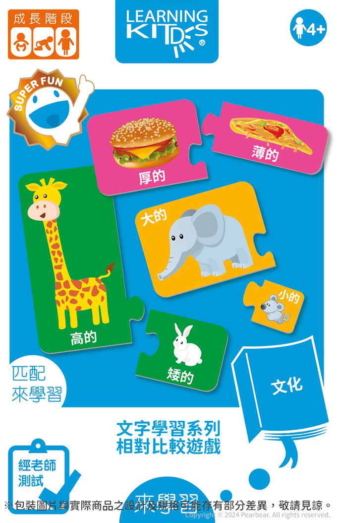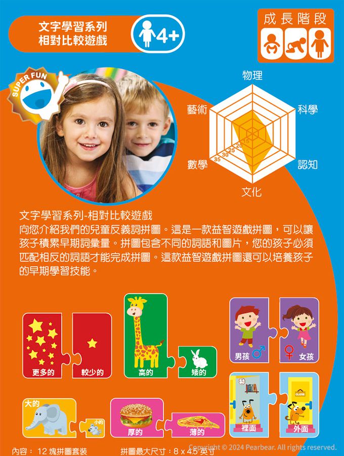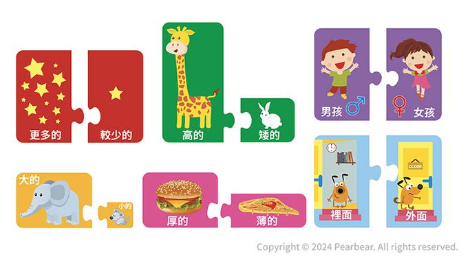 這是一款相對詞拼圖,讓孩子積累早期詞彙量。認識相對詞,例如:大小、厚薄等。拼圖包含不同的詞語和圖片,我們必須匹配相反的詞語才能完成拼圖!