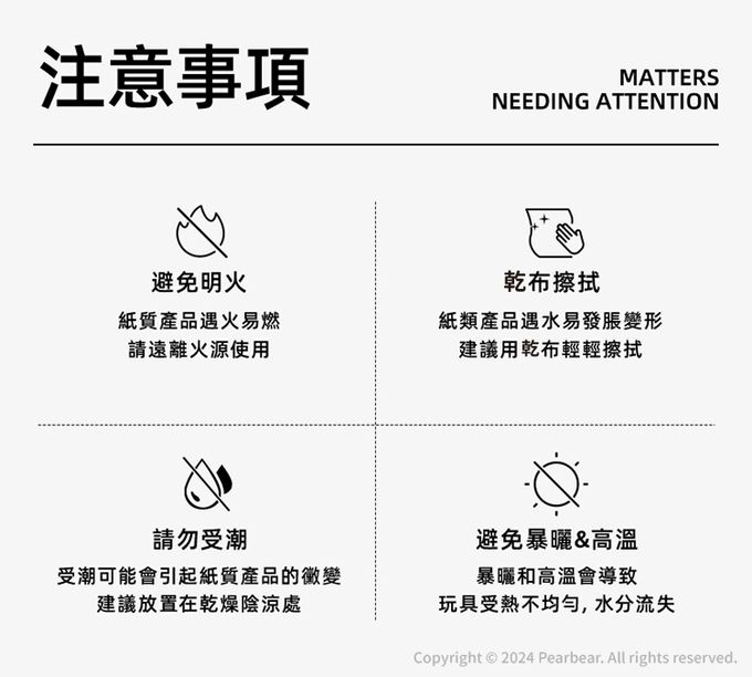 注意事項:為維護兒童安全,請在成人監督下使用,本玩具內 含小物件,有銳邊或尖端,或者兩者皆有,不適合 未滿3歲兒童使用,且應避免吞食造成窒息。為避 免嬰兒或兒童產生窒息之危險,請於拆卸後,立即 將塑膠袋遠離嬰兒及兒童。請遠離火源。