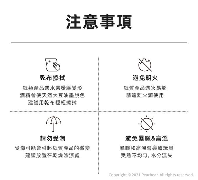 注意事項:為維護兒童安全,請在成人監督下使用,本玩具內 含小物件,有銳邊或尖端,或者兩者皆有,不適合 未滿3歲兒童使用,且應避免吞食造成窒息。為避 免嬰兒或兒童產生窒息之危險,請於拆卸後,立即 將塑膠袋遠離嬰兒及兒童。請遠離火源。
