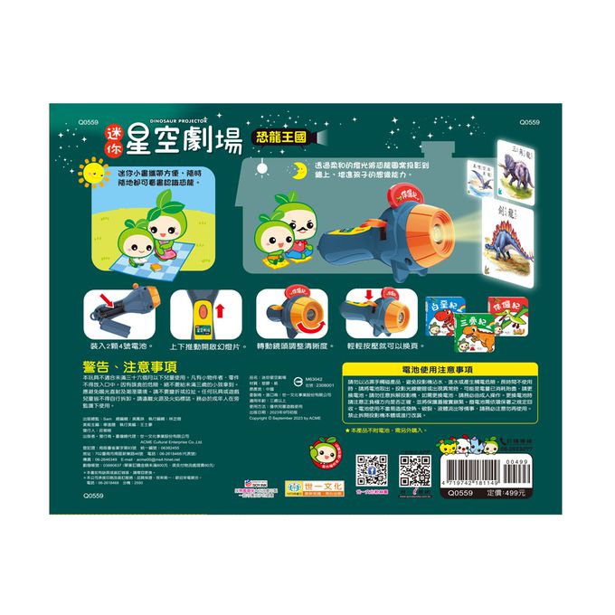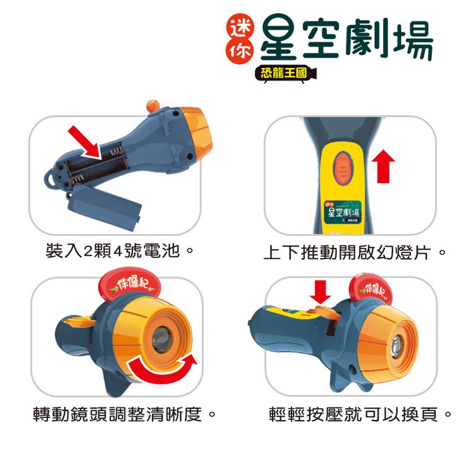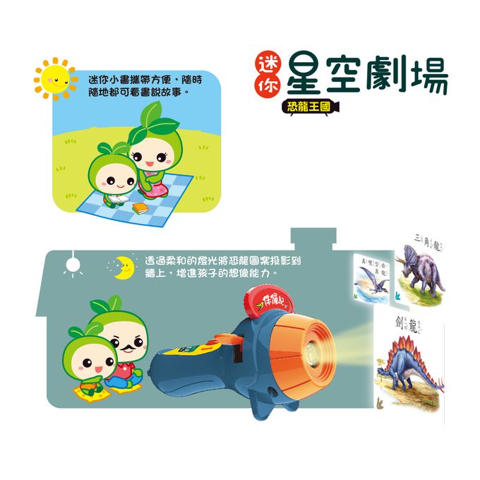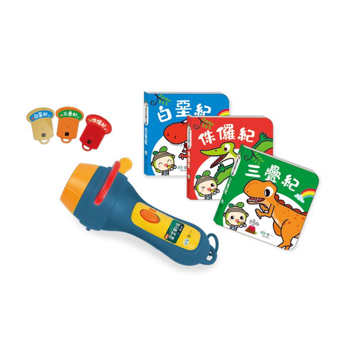 本產品內含一支手電筒投影機,3片擬真恐龍投影片以及3本恐龍介紹厚紙小書.透過手電筒投影機就可以在牆上投射出恐龍畫面,或者可以和孩子一起躺在床上 ,將恐龍投射在天花板上,在輕鬆舒服的環境下親子一同敘說對恐龍世界的想像.依據恐龍不同世紀的存在時間點,挑選耳熟能詳又具特色的恐龍品種,再依據 所存在的不同世紀所規劃的三本恐龍介紹小書,讓爸爸媽媽能輕鬆的和孩子一起 認識恐龍的基本資訊.