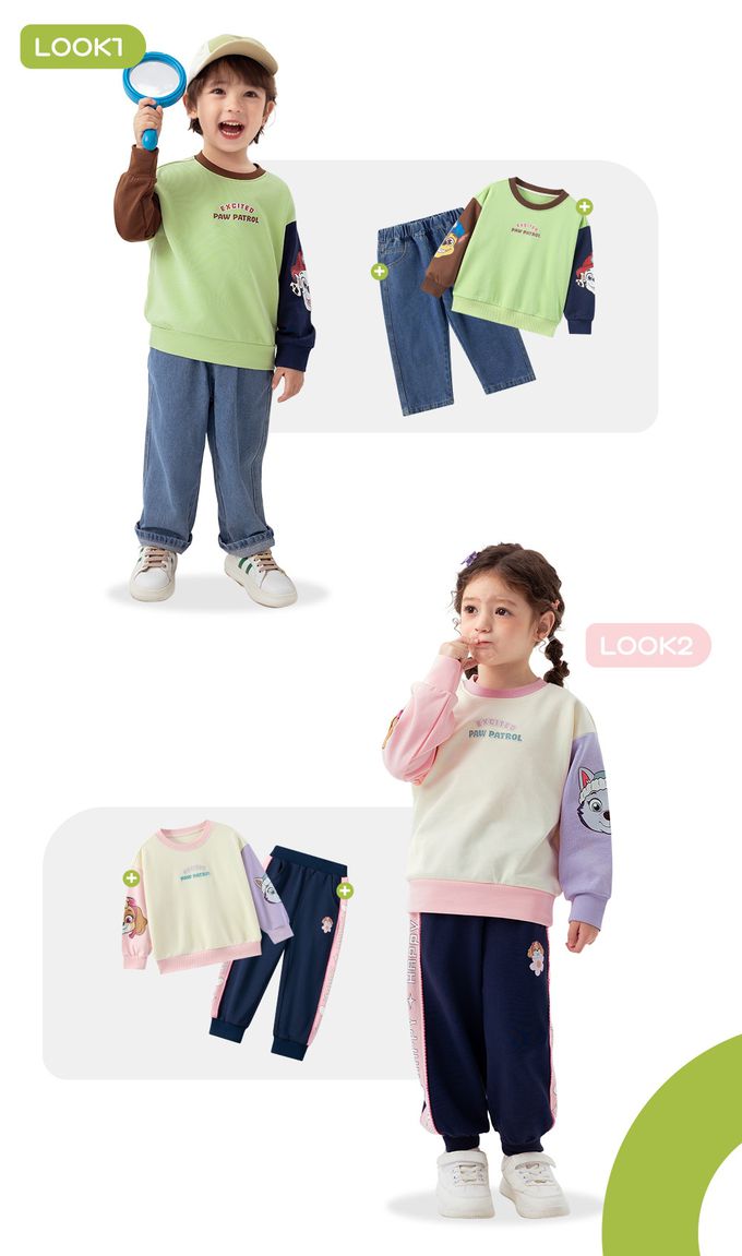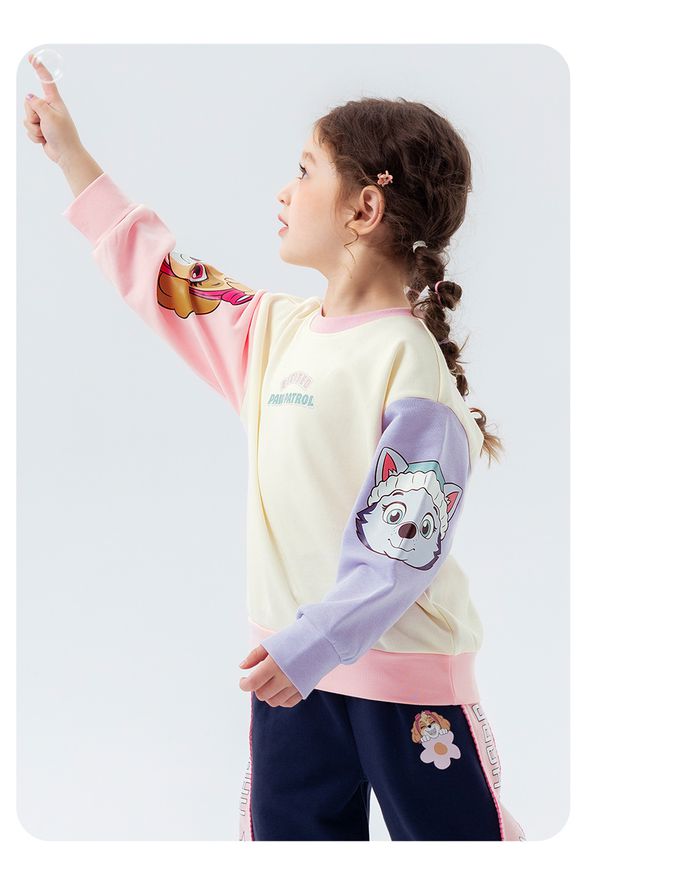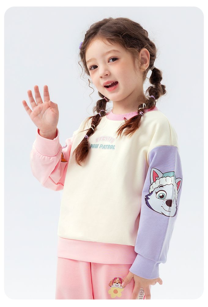 卡通汪汪隊撞色袖印花長袖上衣/大學T-卡通人物天天-杏+粉紫