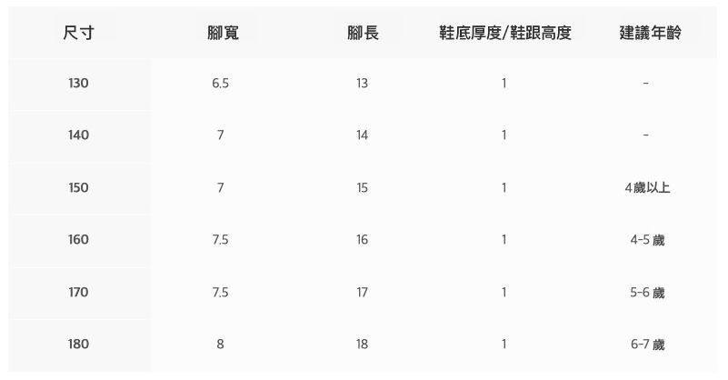 2. 每個尺寸的建議年齡、建議身高僅供參考,每位孩子發育狀況各有不同,建議參考寶貝現有的鞋子尺寸做對照。
