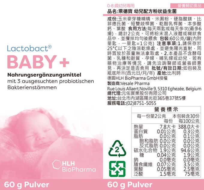 成分:玉米麥芽糊精、米澱粉、硬脂酸鎂、比菲德氏菌、短雙歧桿菌、乾酪乳桿菌、本多酸鈣、葉酸