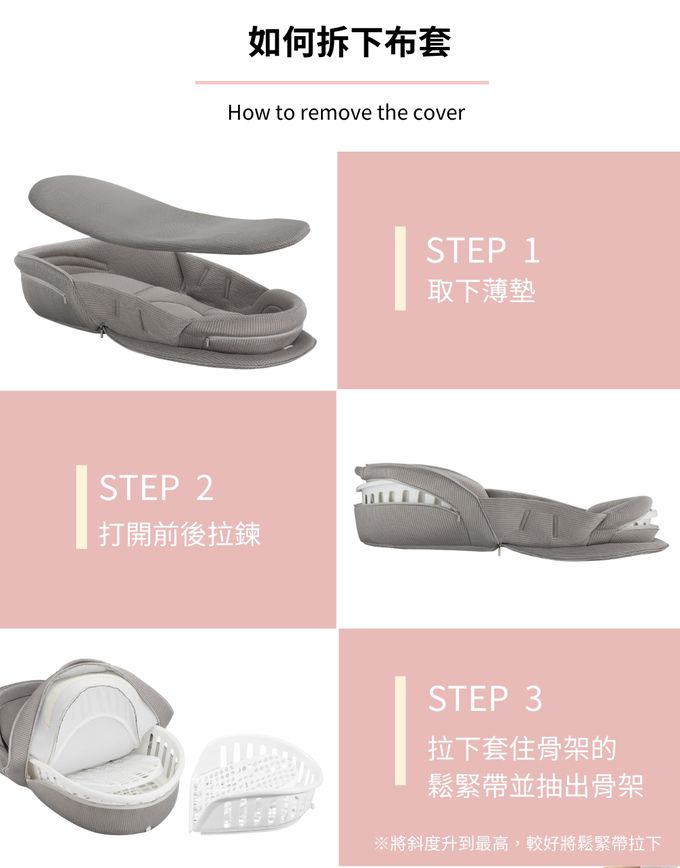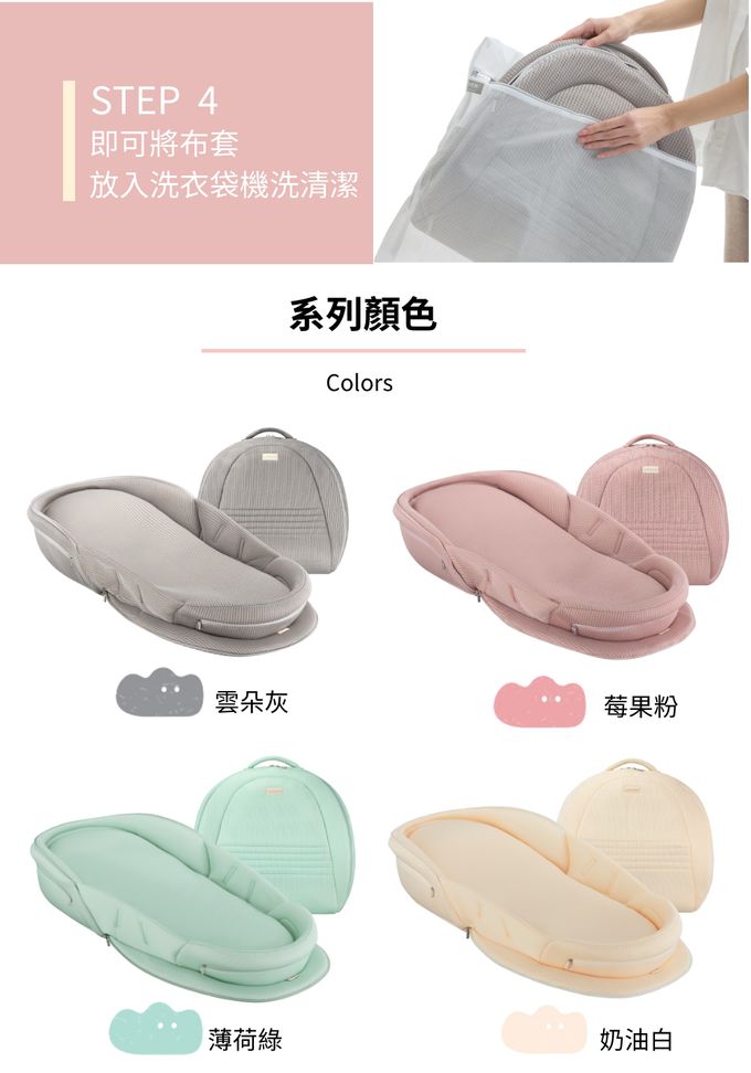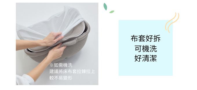 洗滌/清潔建議:建議手洗較不易變形,本體外罩布套與床墊皆可機洗,清洗前請先確認布套內部洗滌標示,以確保適用之清洗方式。 清洗前請取出內部的塑料床架,為防止變形,請將所有布套拉鍊都拉上,並放入洗衣袋內與其他衣物分開清洗。 使用洗衣機時,請選擇冷水或溫水(不超過30°C),並選擇弱洗、柔洗模式進行洗滌。 請使用不含漂白劑的中性洗滌劑(例如嬰幼兒衣物專用洗劑)。 為防止面料變形及毀損,洗滌後請於通風良好的陰涼處平鋪晾乾,避免日曬及吊掛。 不可乾洗。