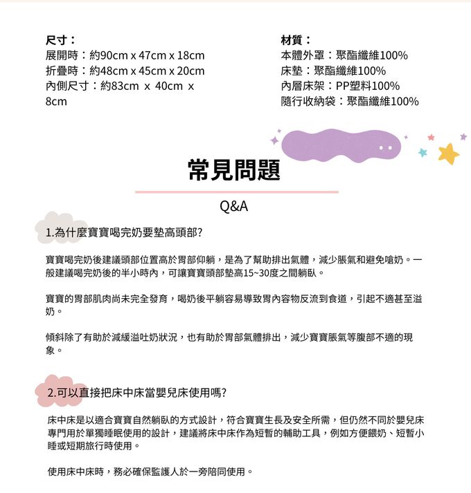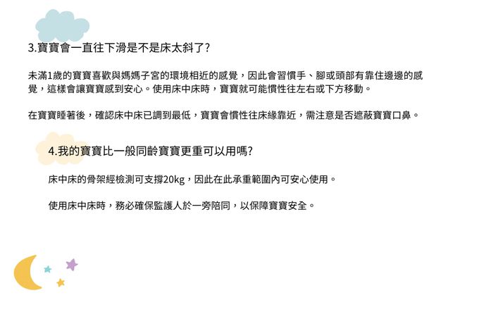 注意事項:使用床中床時,務必確保監護人於一旁陪同使用。※產品保固及使用注意事項詳情,請務必詳細閱讀產品說明書!