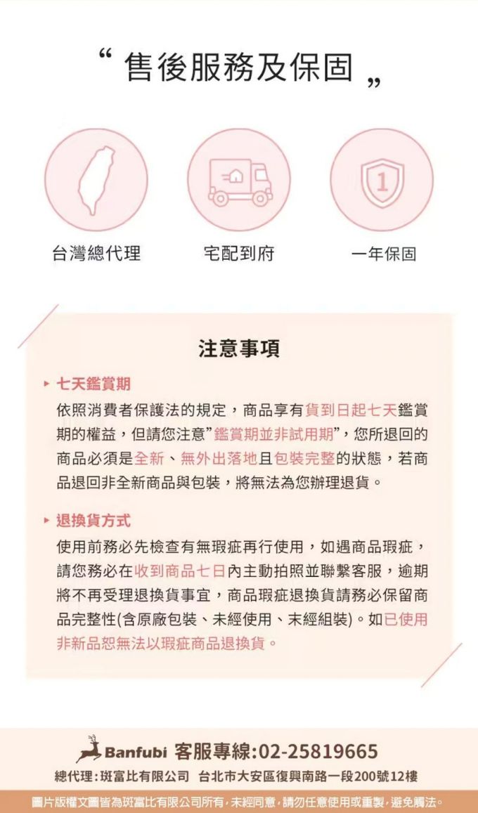 保固:保固期間:自購買後商品送達日起1年內 保固範圍:正常使用下,床架部分可享1年保固(詳細保固規範請參照產品說明書所示) 保證期間內,若非人為造成之零件短少、加工不良等可歸責於本公司之產品瑕疵或故障問題,依照使用說明書及注意事項並且在正常使用狀態下故障者,根據保固規定提供免費修繕或更換。 商品相關問題歡迎詢問官方LINE帳號,LINE官方帳號ID:@banfubi