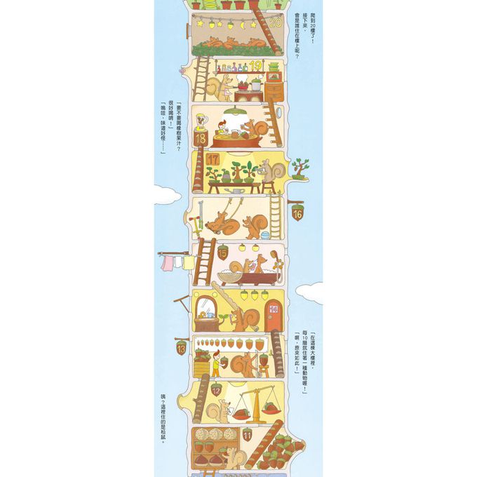 原來,在這棟奇妙的建築裡,每隔十層樓,就是一種動物的家呢!松鼠、瓢蟲、青蛙、蜜蜂……仔細看,每層樓都有不同的布置、也都代表了主人的個性喔!那……住在第100層樓的,到底是誰呢?